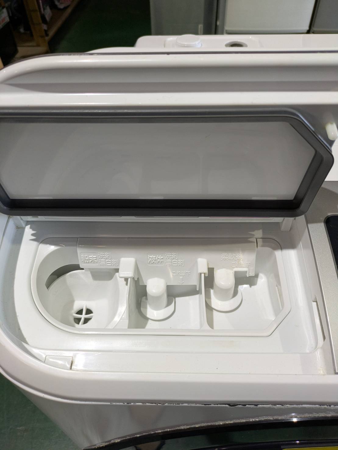 こちらのドラム式洗濯機は洗剤投入ケースのフタが本来「押す」の箇所を押すと開くのですが、開きが弱く画像のように上部を手で押さないと開きません。訳有品として出品しております。動作は問題ございません。