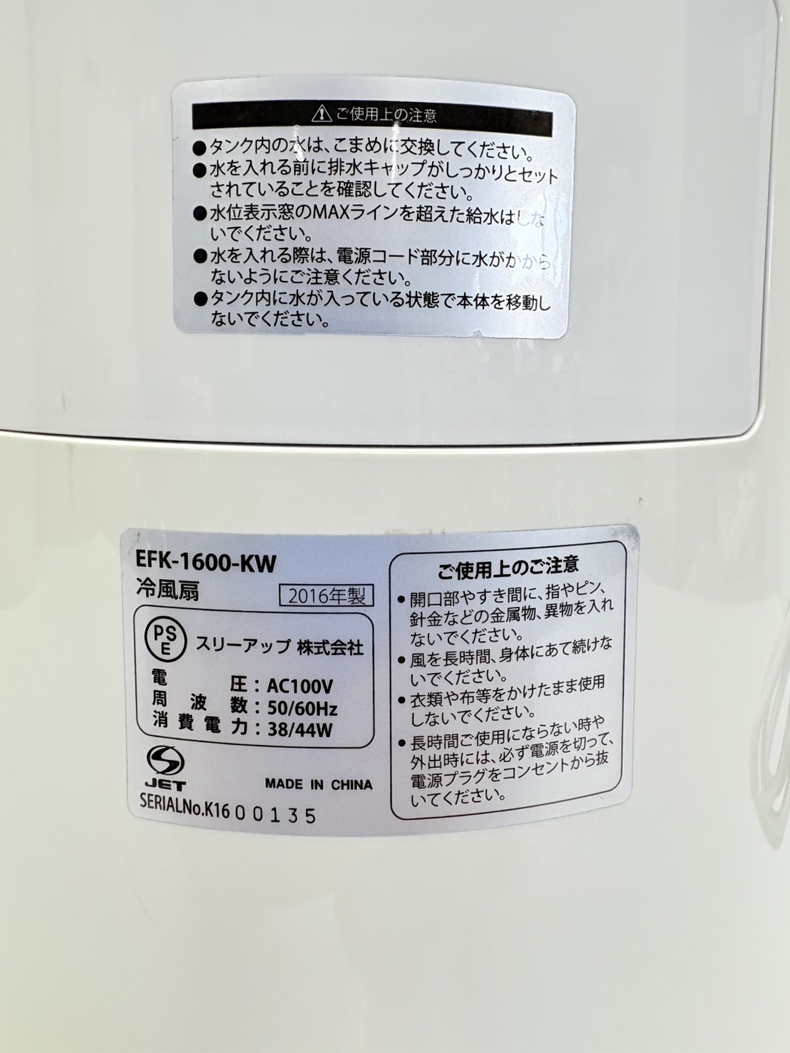 スリーアップ2016年製冷風機 型番 EFK-1600-KW 風量調節 3段階 サイズ(幅×奥行×高さ) 250×250×930㎜ 首振り機能付き 質量 4.5㎏ Rank B 【コンデションなど】 ボディに日焼けがございます。 【保証期間】 商品到着から2カ月