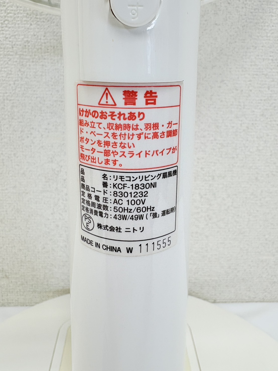 ニトリ2021年製扇風機 型番 KCF-1830NI 幅x高さx奥行き 360x660x360 mm Rank B 【コンデションなど】 細かいキズ汚れございます。 【保証期間】 商品到着から2カ月