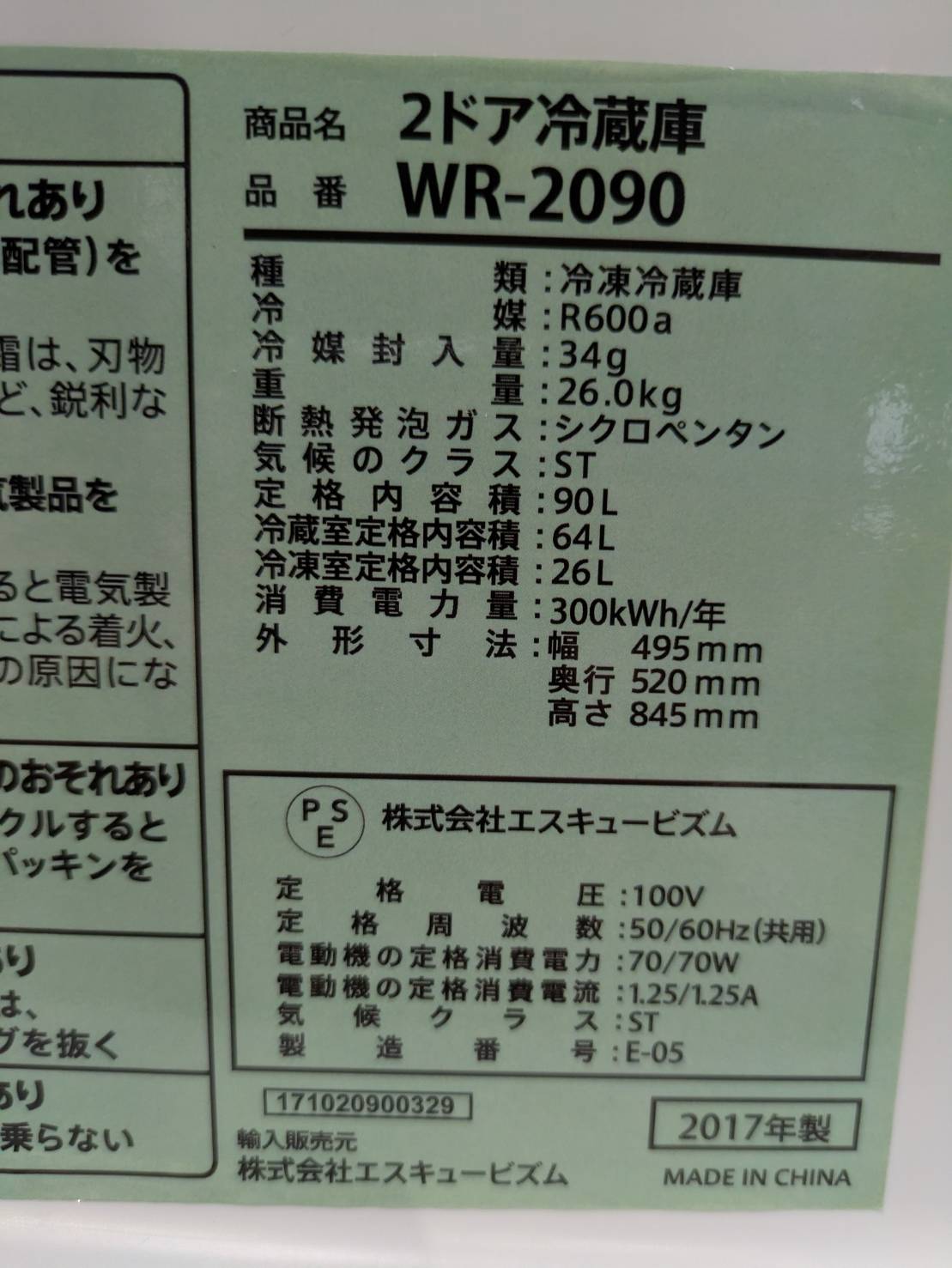エスキュービズム2017年製90L冷蔵庫 型番 WR-2090 幅 奥行き 高さ 495*520*845㎜ 容量 冷凍室26L 冷蔵室64L 動作テスト 冷凍-20℃ 冷蔵3℃ 評価ランク B 【コンデションなど】 冷凍室扉上部に擦り傷があります。取説、製氷皿付属商品です。 【製品特徴】 電子レンジを乗せて使える耐熱100度のトップテーブルを採用した、直冷式タイプの単身用冷蔵庫。 【保証期間】 商品到着から6カ月