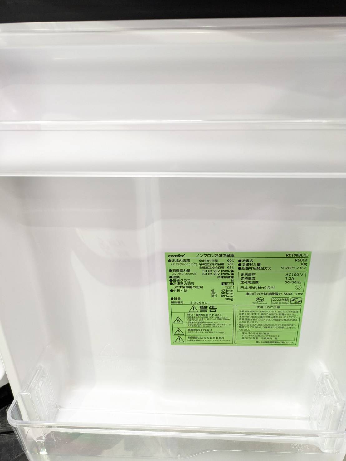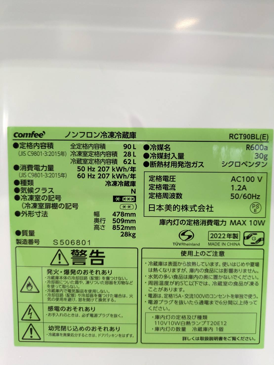 Comfee2022年製90L冷蔵庫 型番 RCT90BL 幅 奥行き 高さ 478*509*852㎜ 容量 冷凍室28L 冷蔵室62L 動作テスト 冷凍-28℃ 冷蔵1℃ 評価ランク A 【コンデションなど】 天板擦り傷があります。取説付属商品です。 【製品特徴】 電子レンジを乗せて使える耐熱100度のトップテーブルを採用した、直冷式タイプの単身用冷蔵庫。 【保証期間】 商品到着から6カ月