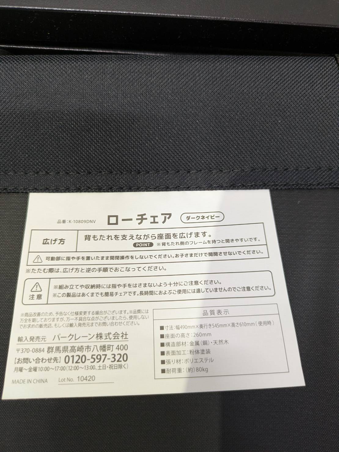 ほとんど使用感のない折り畳み式のローチェアーです。軽いので持ち運びに便利!アウトドアにも最適です。 折り畳み式ローチェア ダークネイビー サイズ 幅×奥行×高さ 49*55*26(座面)cm 評価ランク A