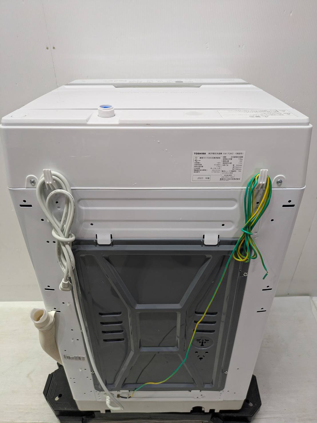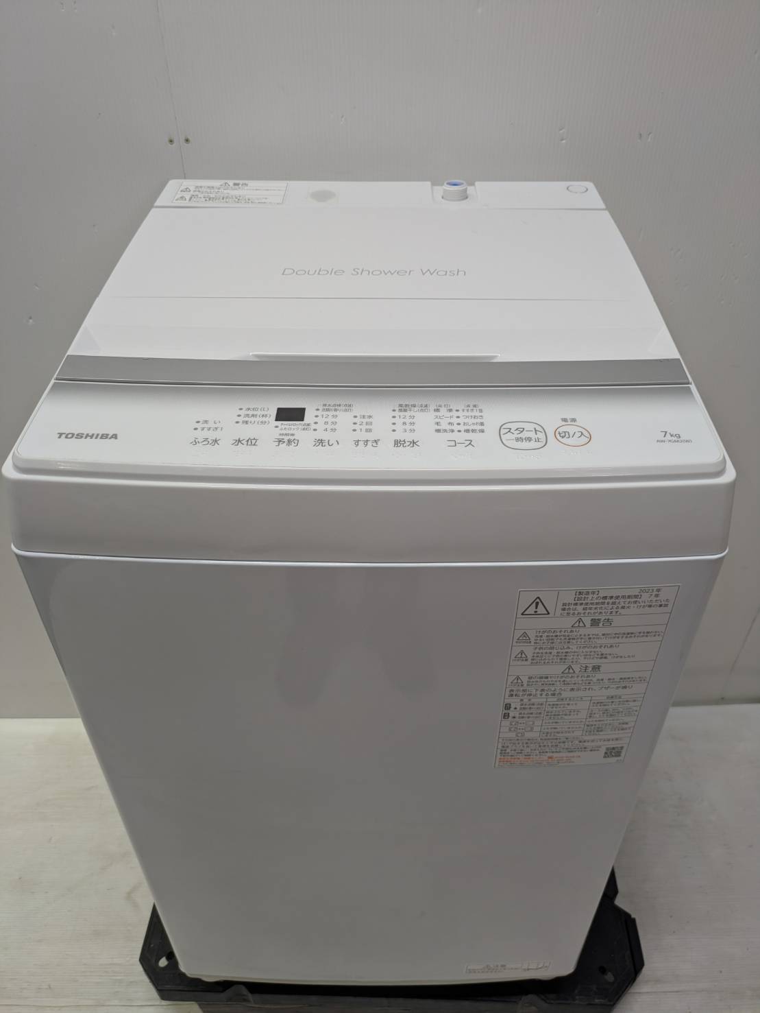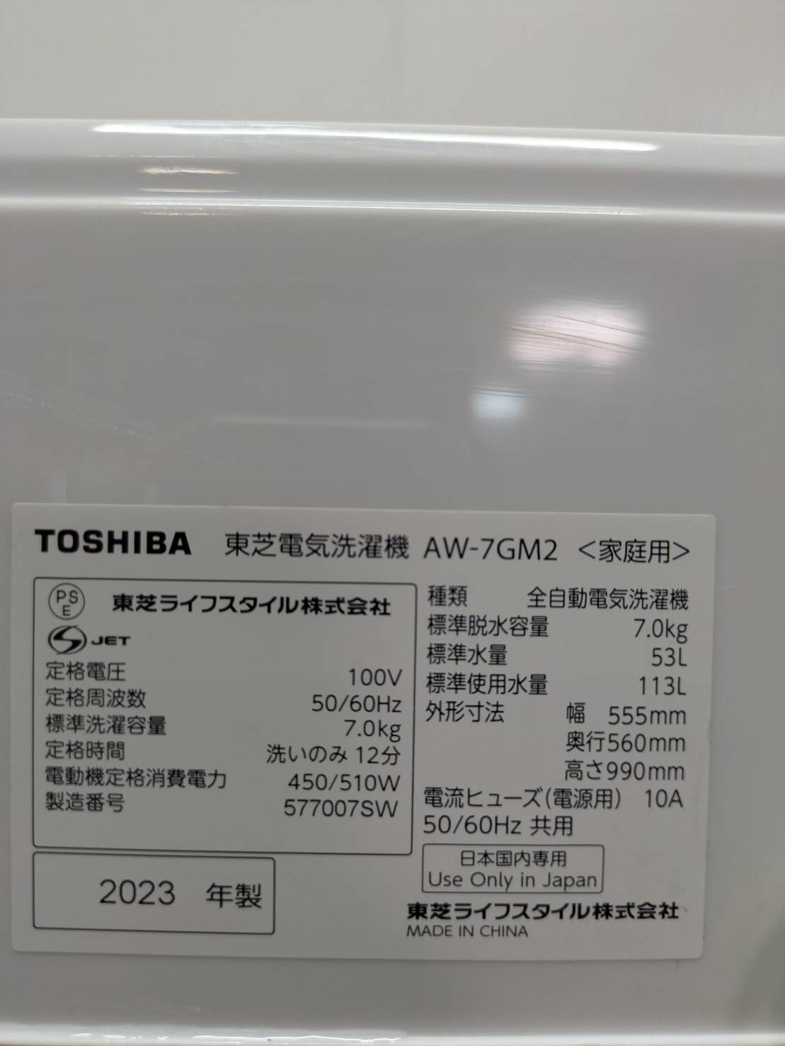 TOSHIBA2023年製7.0Kg洗濯機 型番 AW-7GM2 幅*奥行*高さ 555*560*990㎜ 動作テスト 洗い・すすぎ・脱水OK 評価ランク A 内部分解清掃済 【コンデションなど】 高年式でキレイです。目立って大きな傷もございません。取扱説明書付きです。 【製品特徴】 「Wシャワー洗浄」採用の縦型全自動洗濯機。2本のシャワーで洗浄液を衣類全体にしっかり浸透させ、ムラを抑えてきれいに洗う。 【保証期間】 商品到着から6カ月