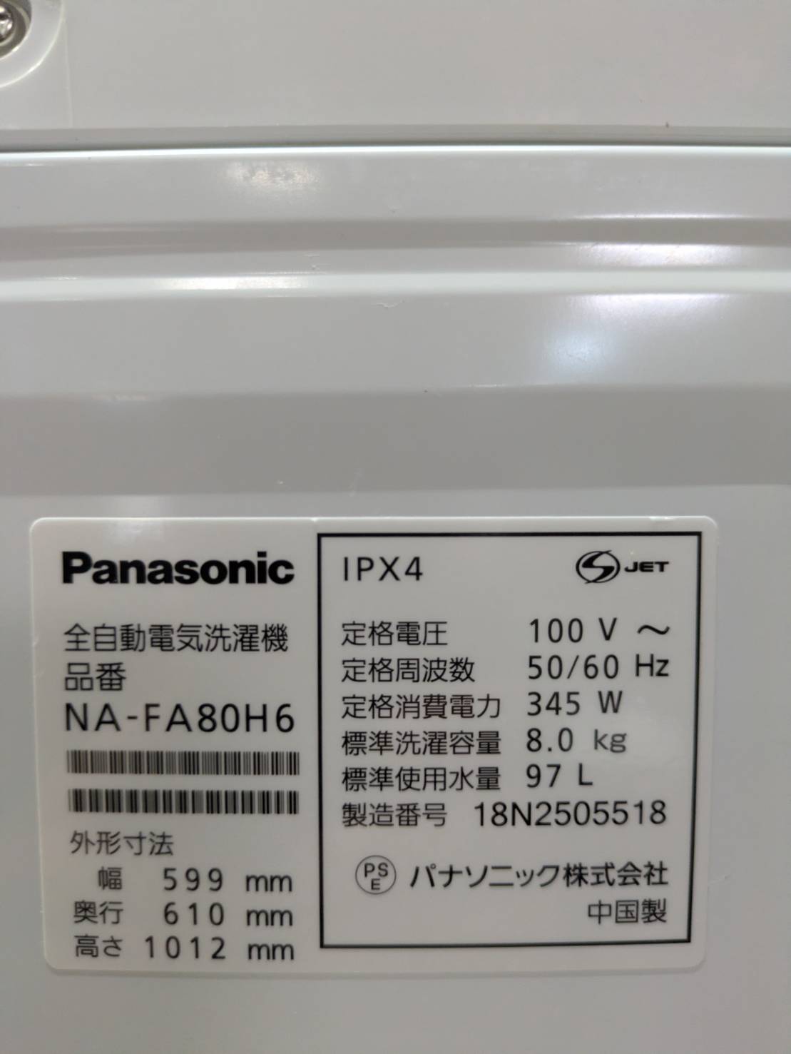 Panasonic2018年製8.0Kg洗濯機 型番 NA-F80H6 幅*奥行*高さ 599*610*1012㎜ 動作テスト 洗い・すすぎ・脱水OK 評価ランク B+ 内部分解清掃済 【コンデションなど】 洗濯槽の底の部分に変色が見られます。 【製品特徴】 静音性の高い洗濯機です。「泡洗浄機能」搭載で衣類をしっかり洗い上げる。洗剤ケース付きだから粉洗剤、柔軟剤も投入も便利です。 【保証期間】 商品到着から6カ月