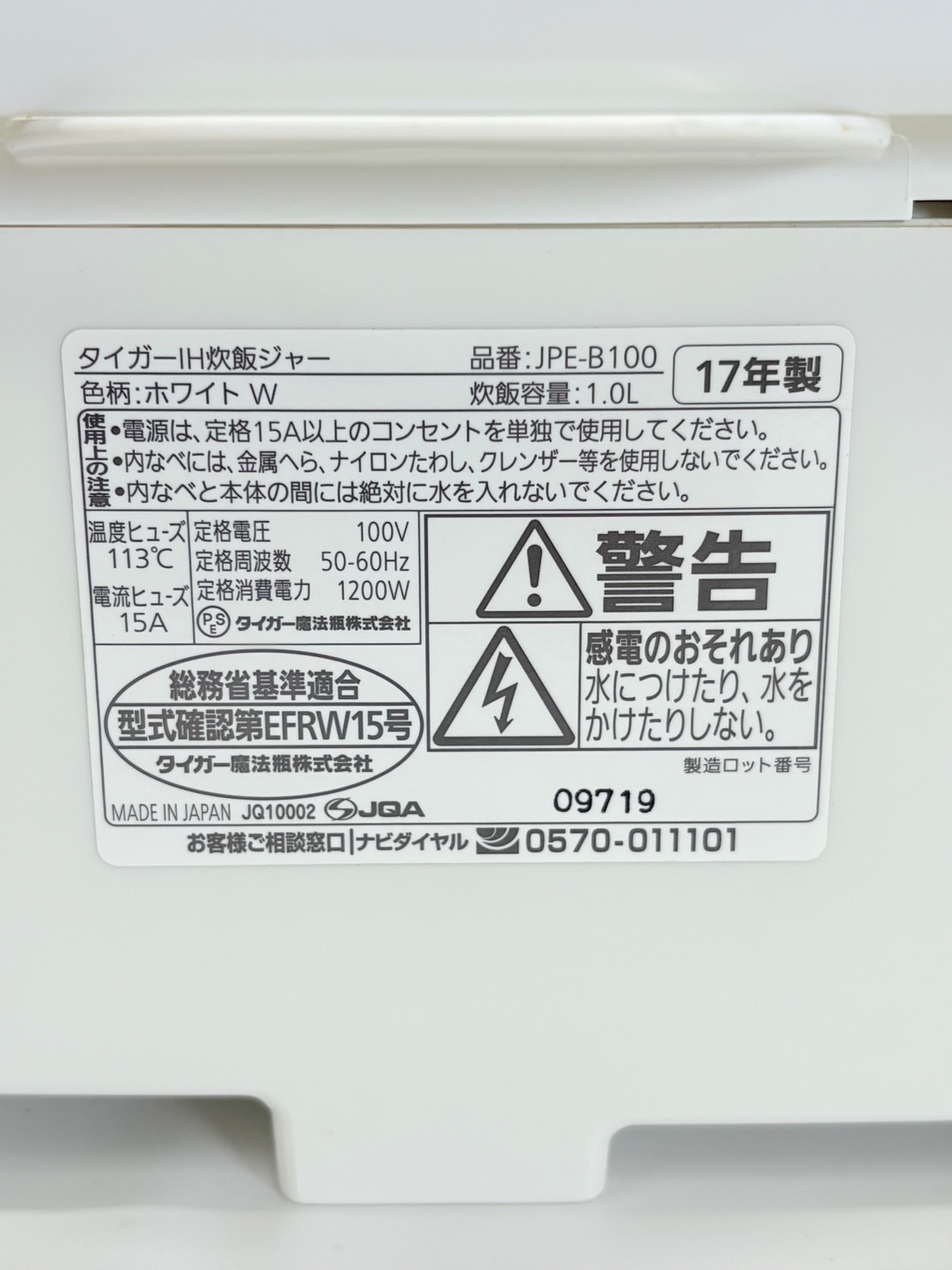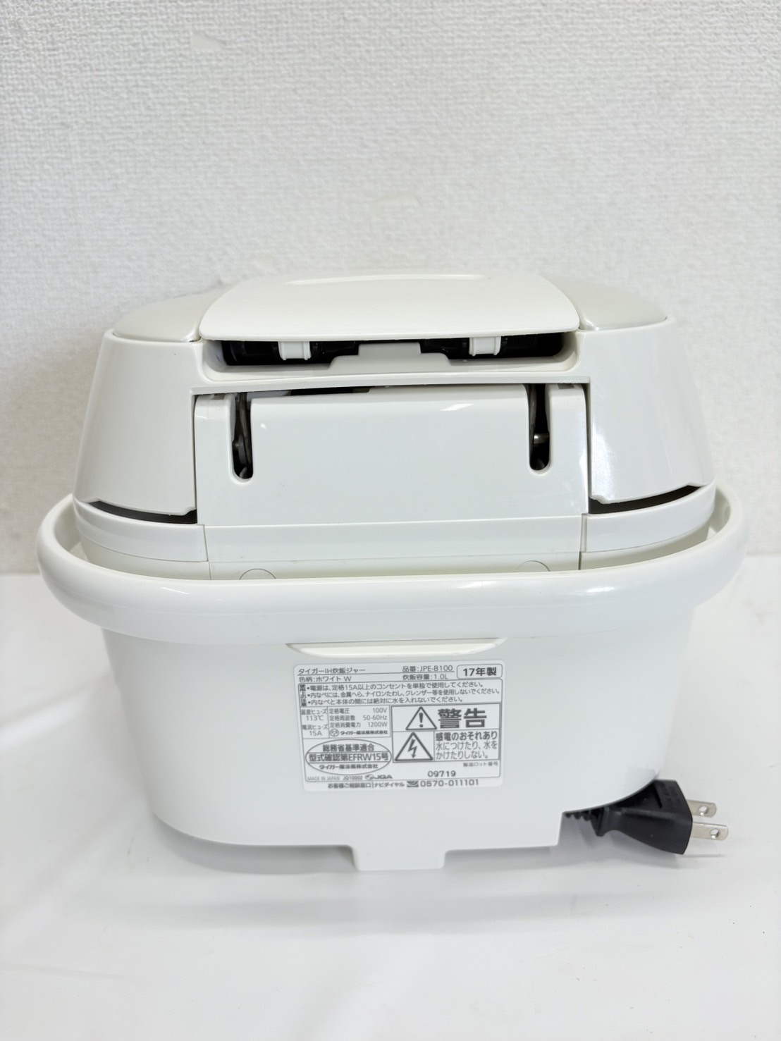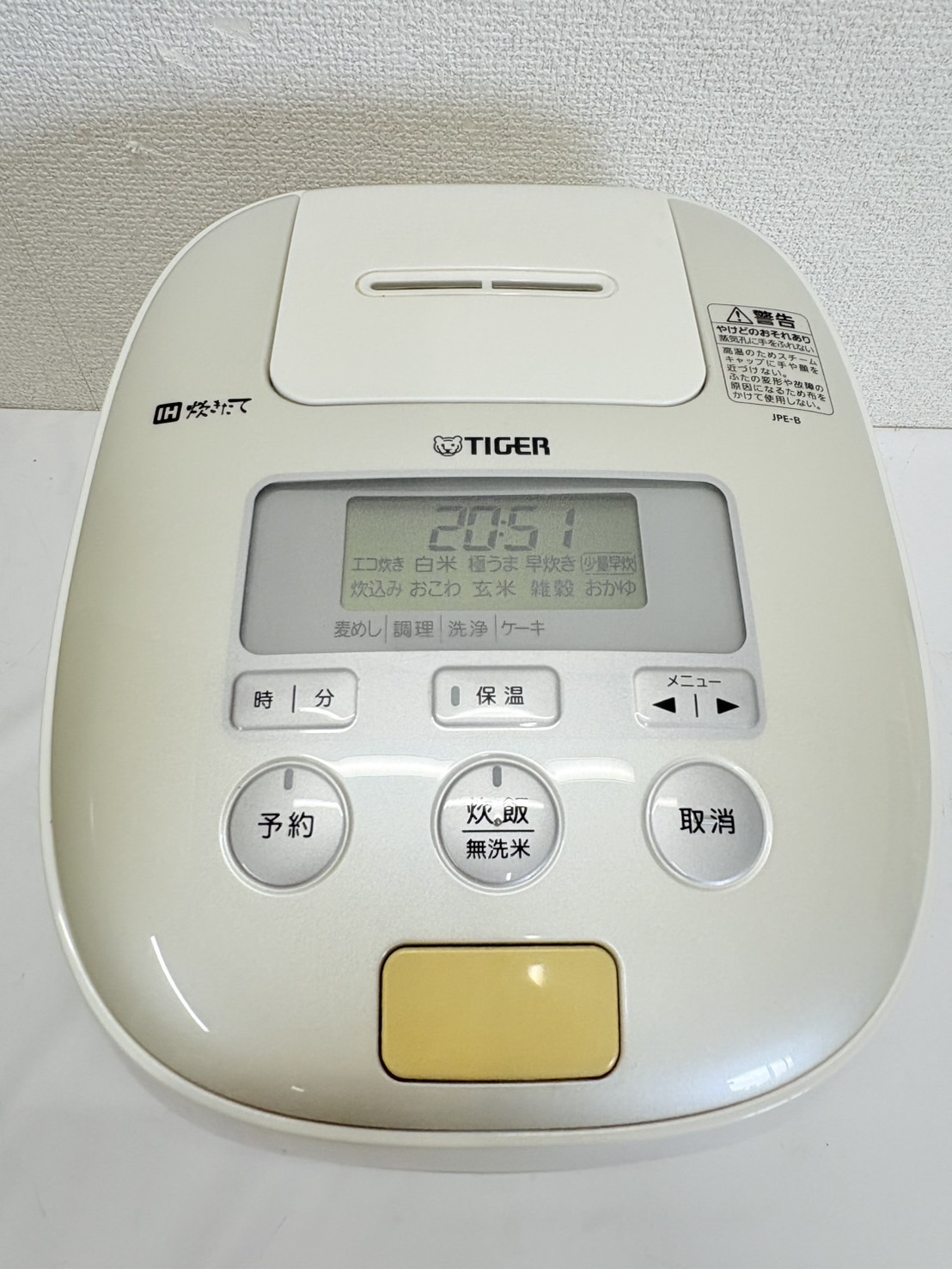 【訳有品】TIGER2017年製5.5合IH炊飯器 型番 JPE-B100 幅x高さx奥行き 272x211x329 mm 炊飯量 5.5合 炊飯方式 IH 動作確認 OK 評価ランク C 【コンデションなど】 内釜にキズが多いです。内ブタを外したところにクラックがございます。 【保証期間】 商品到着から2カ月