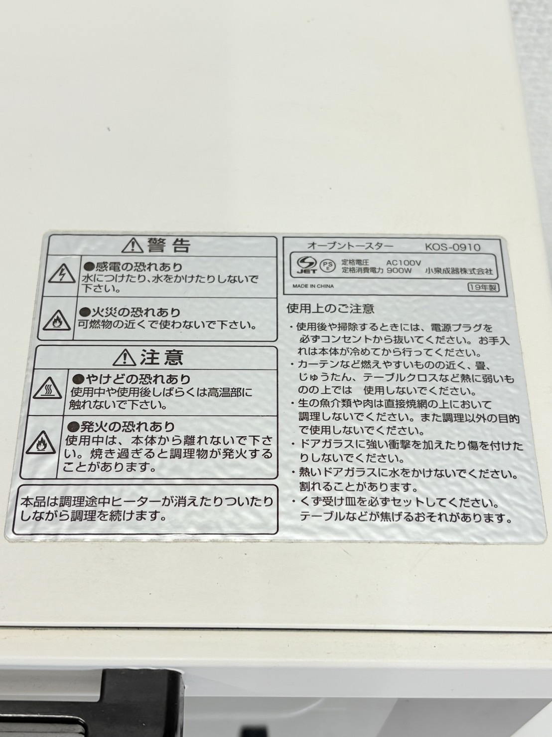 KOIZUMI2019年製オーブントースター 型番 KOS-0910 本体サイズ 360x194x236 mm 庫内サイズ 265x162x170 mm 動作確認 OK 評価ランク B 【コンデションなど】 細かいキズや庫内使用感がございます。 【保証期間】 商品到着から2カ月