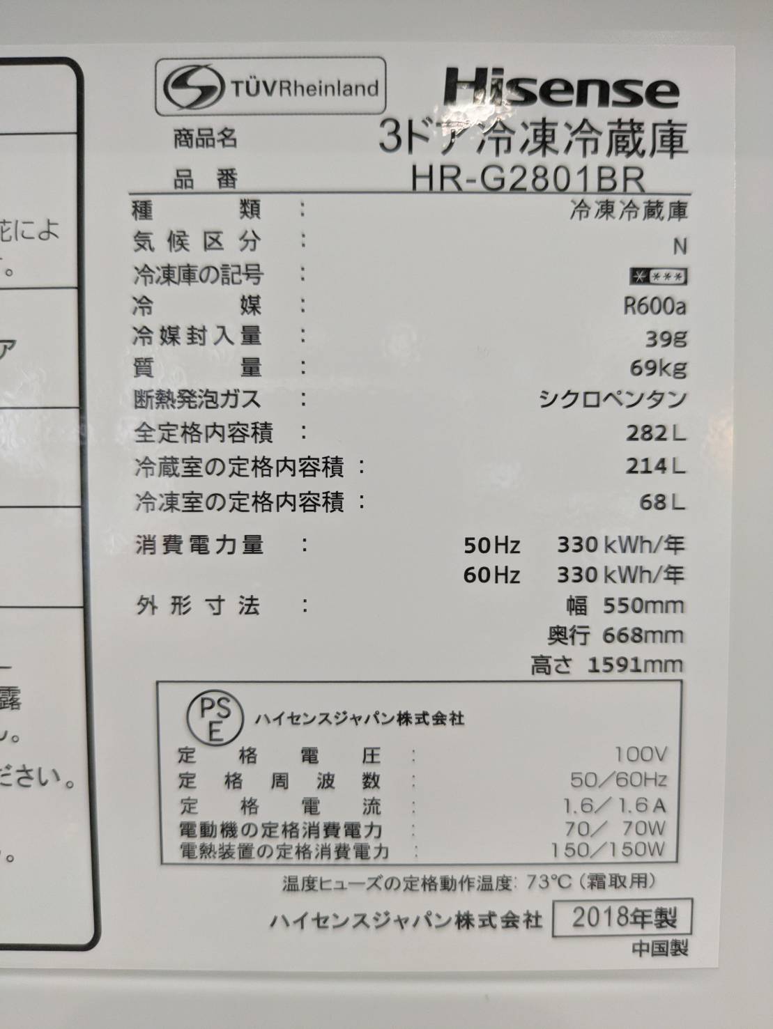 Hisense2018年製282L冷蔵庫 HR-G2801BR