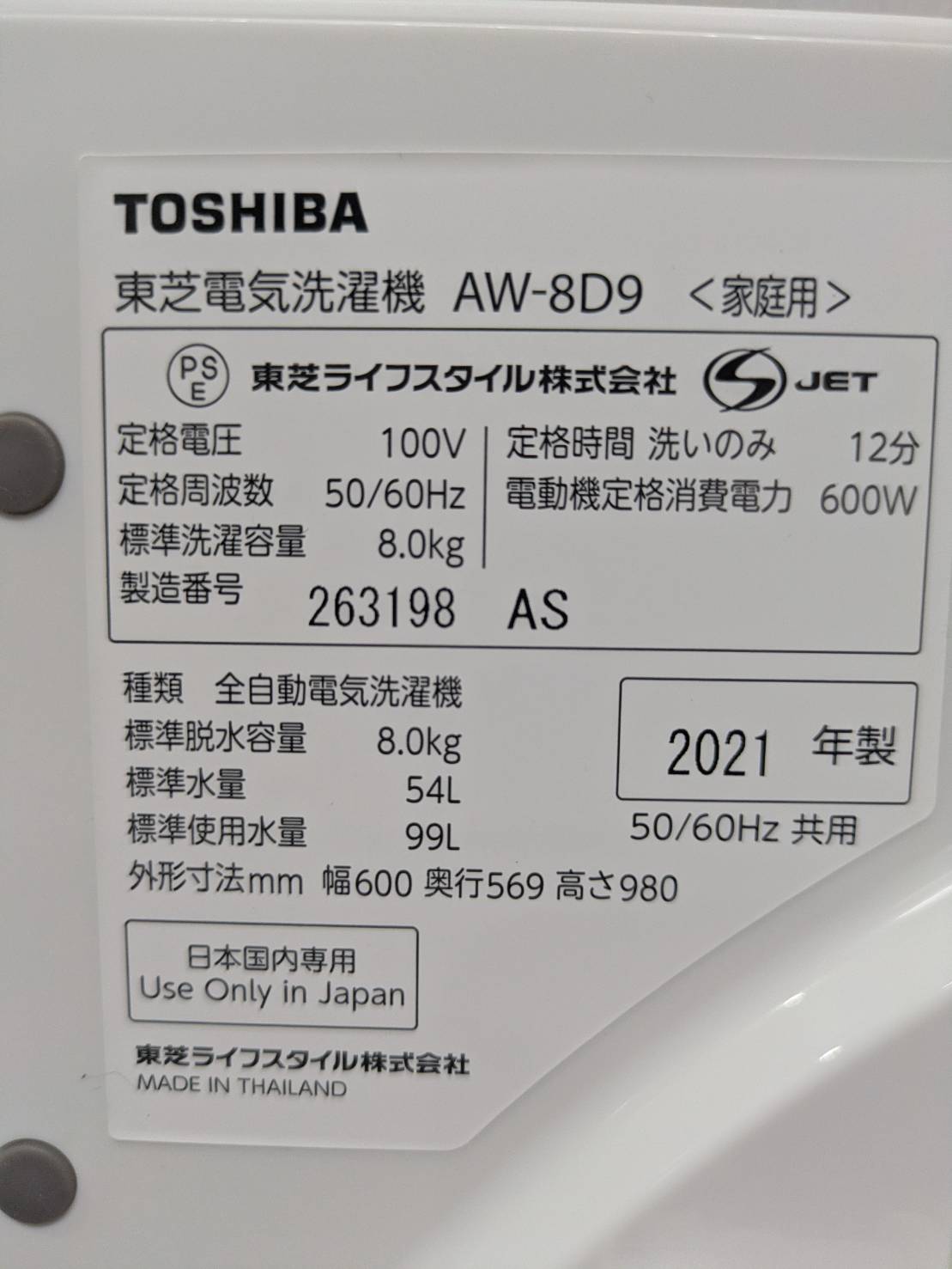 TOSHIBA2021年製8.0Kg洗濯機 AW-8D9
