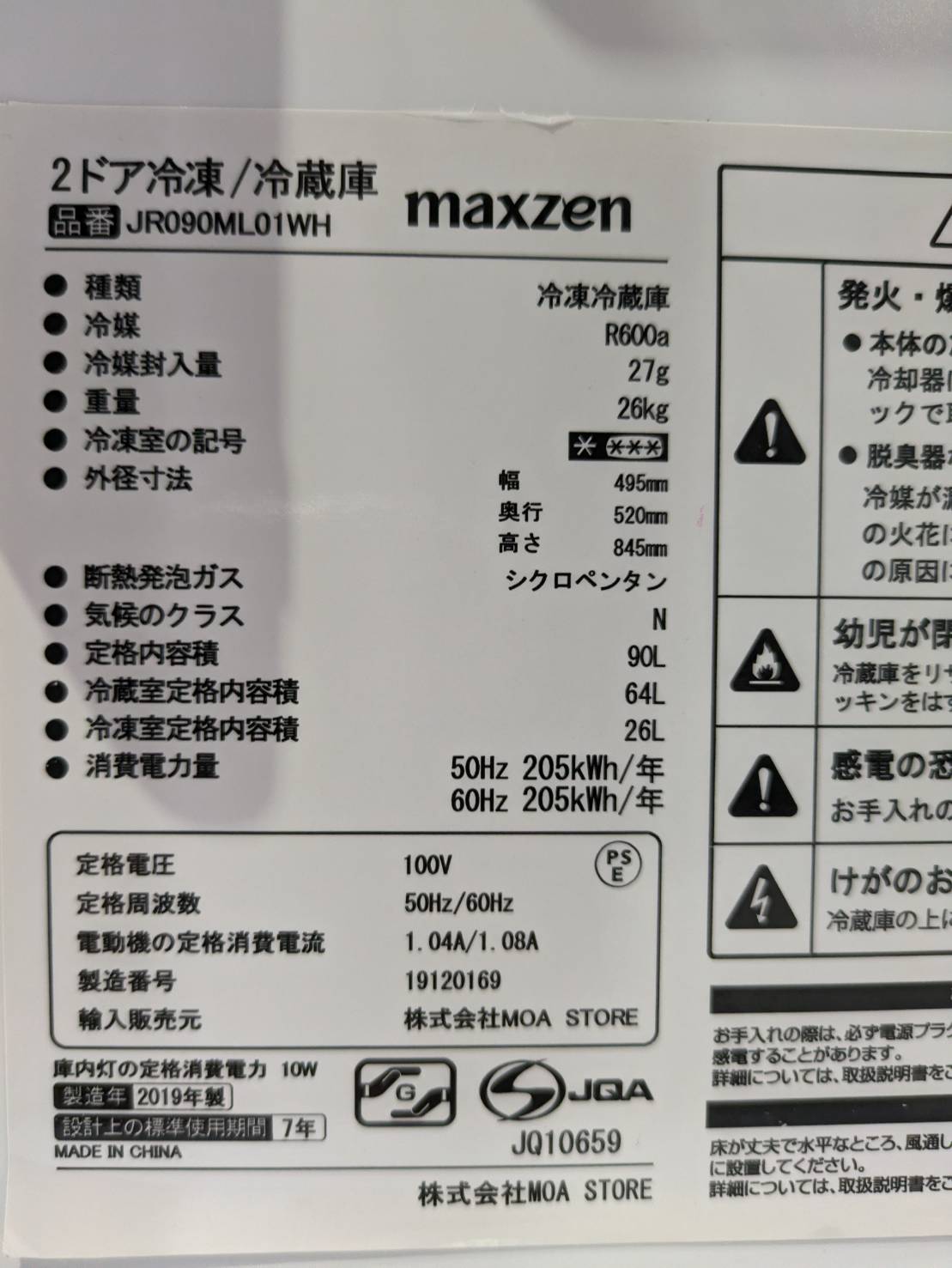 MAXZEN2019年製90L冷蔵庫 型番 JR090ML01WH 幅 奥行き 高さ 495*520*845㎜ 容量 冷凍室26L 冷蔵室64L 動作テスト 冷凍-25℃ 冷蔵3℃ 評価ランク B 【コンデションなど】 ドリンクフォルダのポケットが欠品しています。 【製品特徴】 ●サブとして使える2ドア直冷式冷蔵庫 90L ●耐熱 100℃トップテーブル ●地球にやさしいノンフロン 【保証期間】 商品到着から6カ月