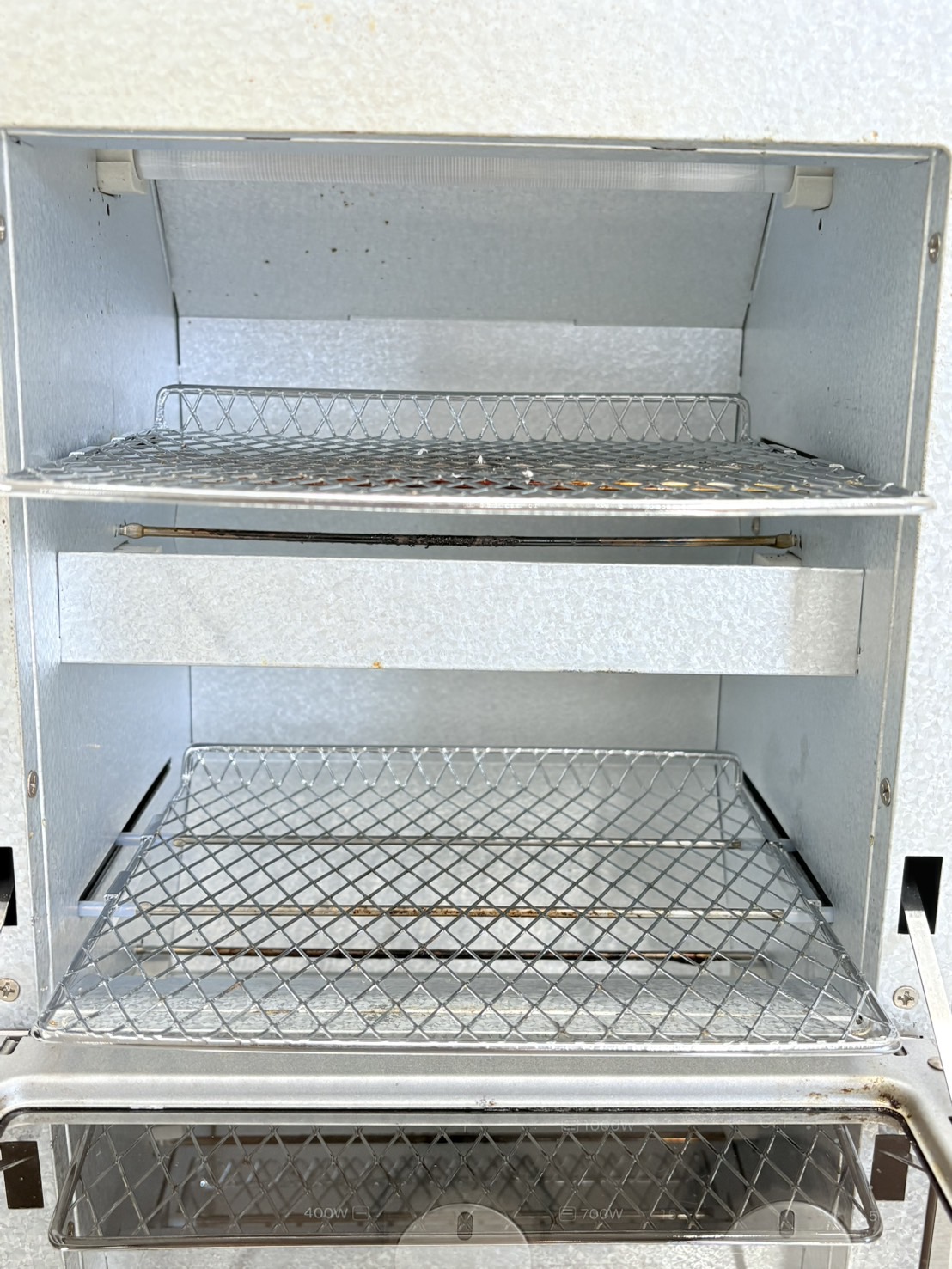 ヒーターは上段・中段・下段の3つ搭載されており、4段階の火力に調整可能。また、メッシュラックを採用したことで食材の焼きムラや焦げ付きを軽減。
