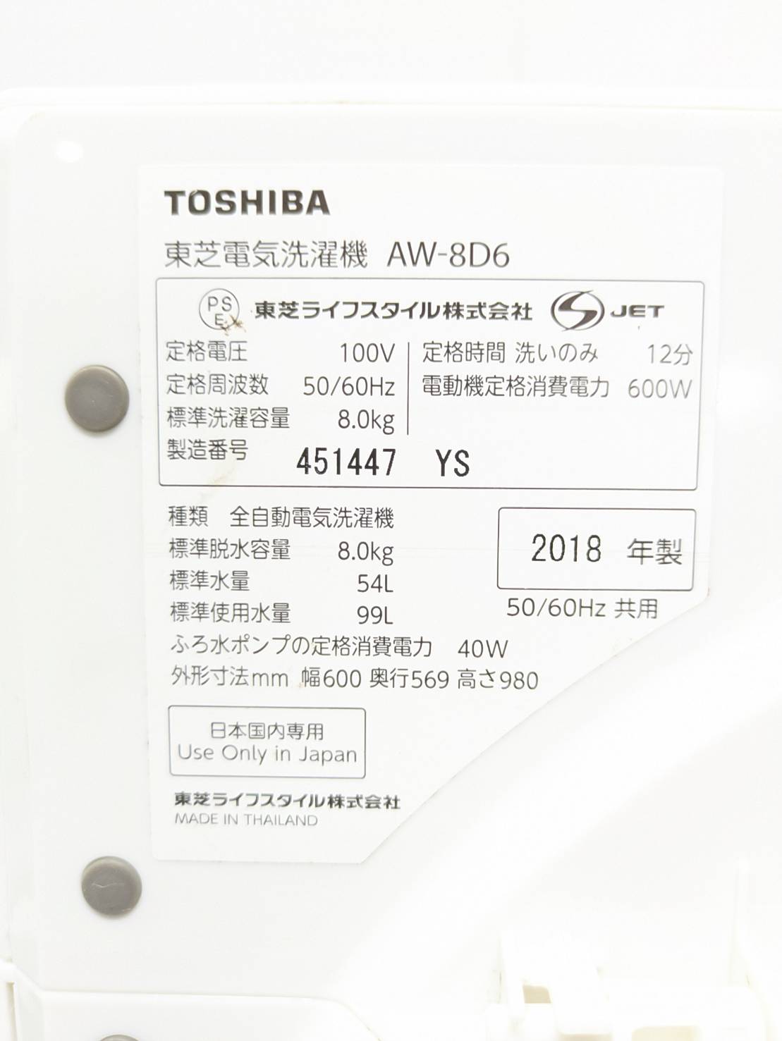 TOSHIBA2018年製8.0㎏洗濯機 AW-8D6
