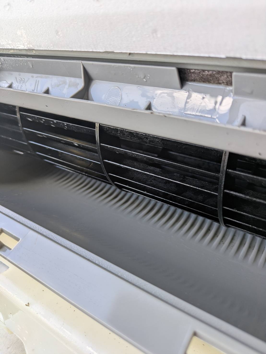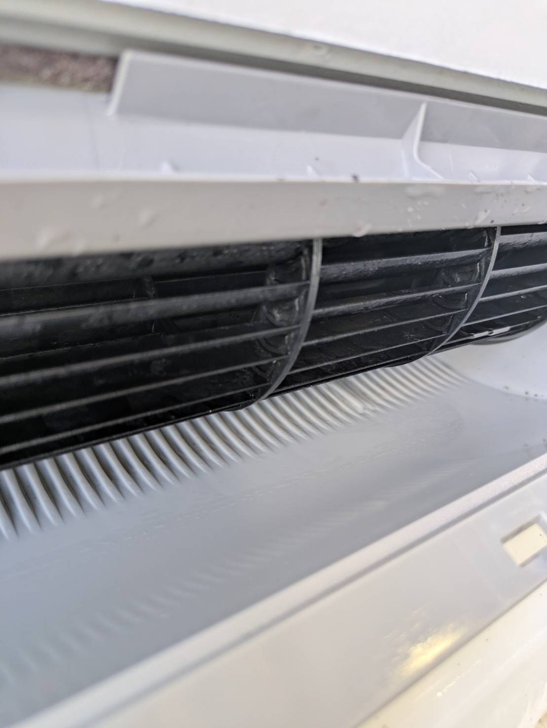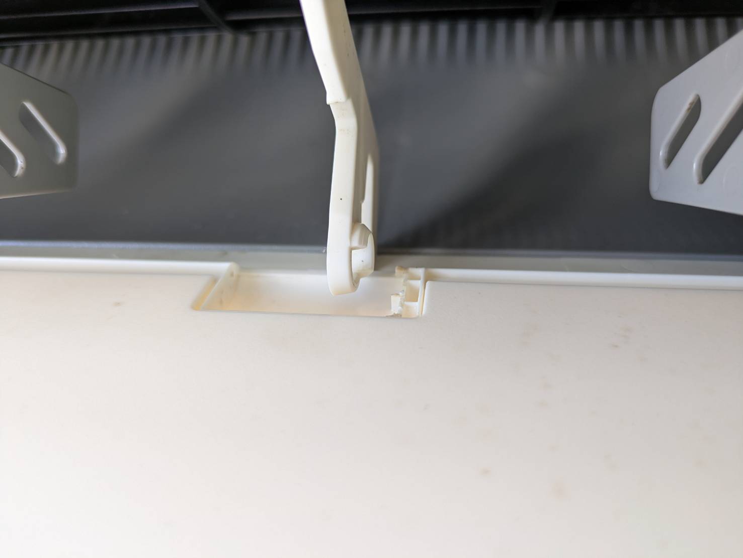 最下段のルーバーの中央のピンが折れてなくなっております。通常動作に問題はありませんが、強風運転の際にルーバーがぶれる可能性があります。