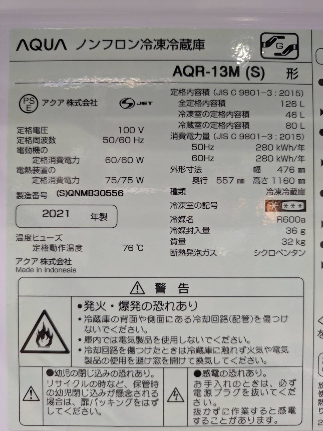 AQUA2021年製126L冷蔵庫 AQR-13M