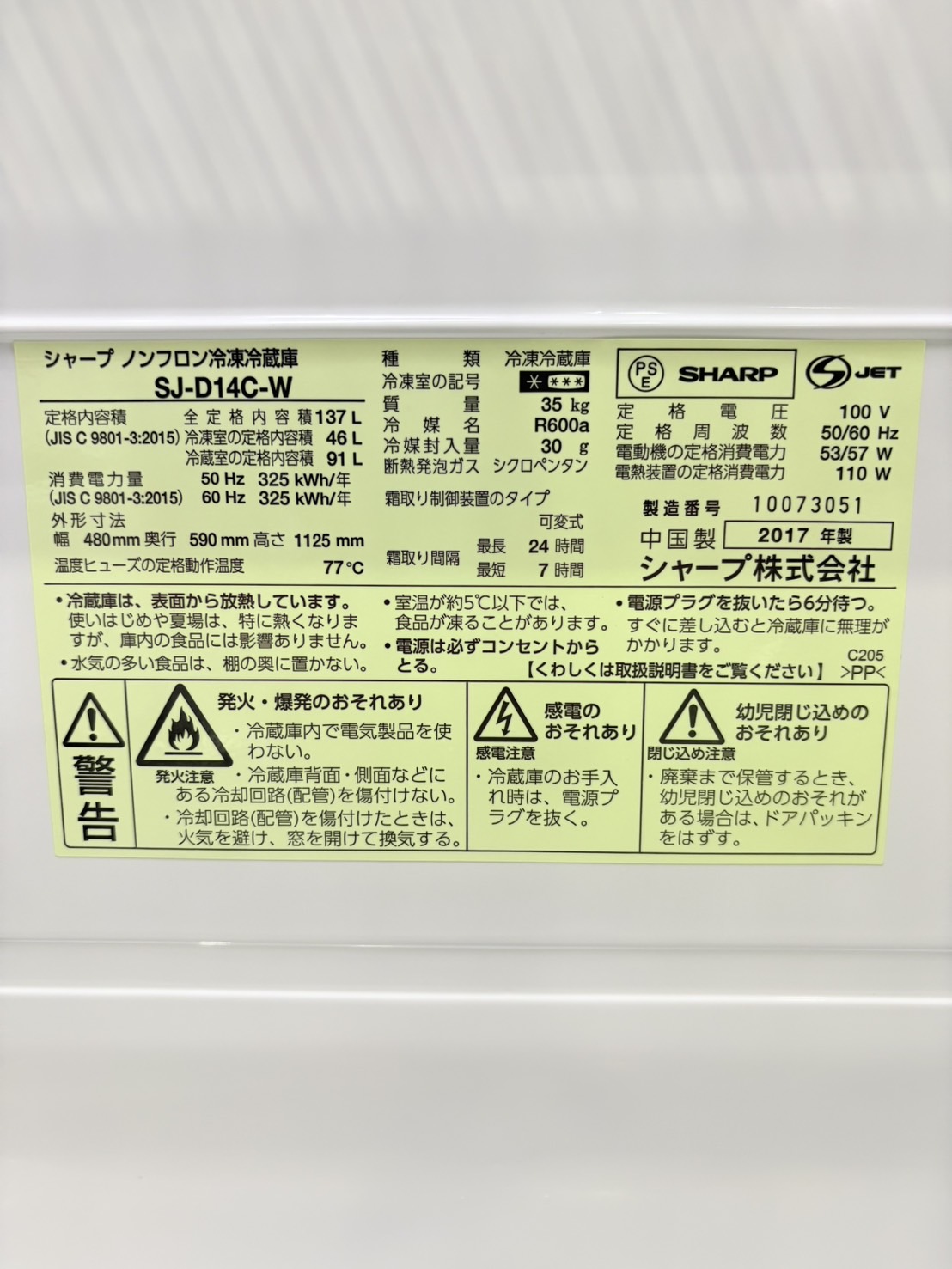 SHARP2017年製137L冷蔵庫 SJ-D14C
