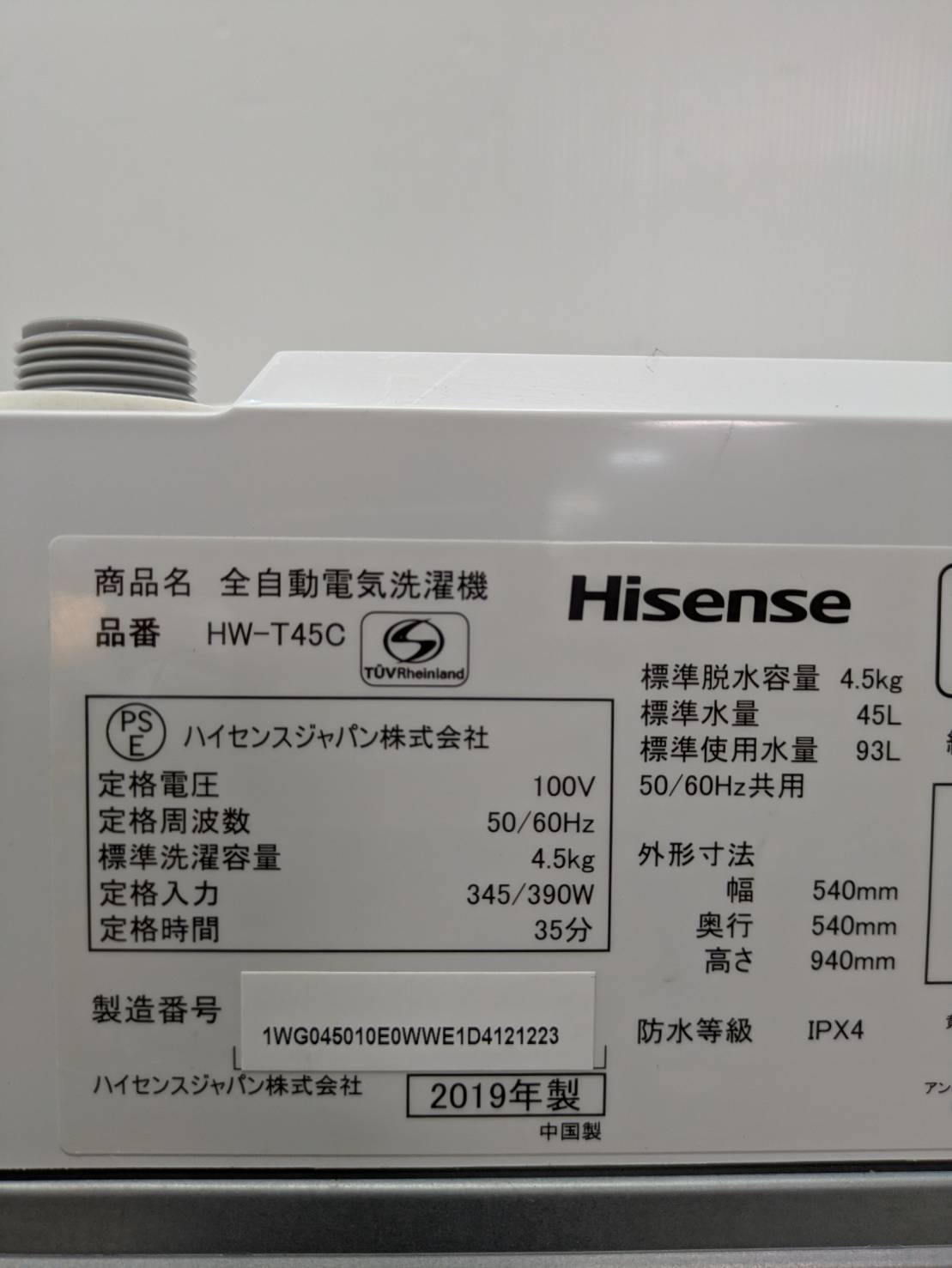 Hisense2019年製4.5Kg洗濯機 HW-T45C