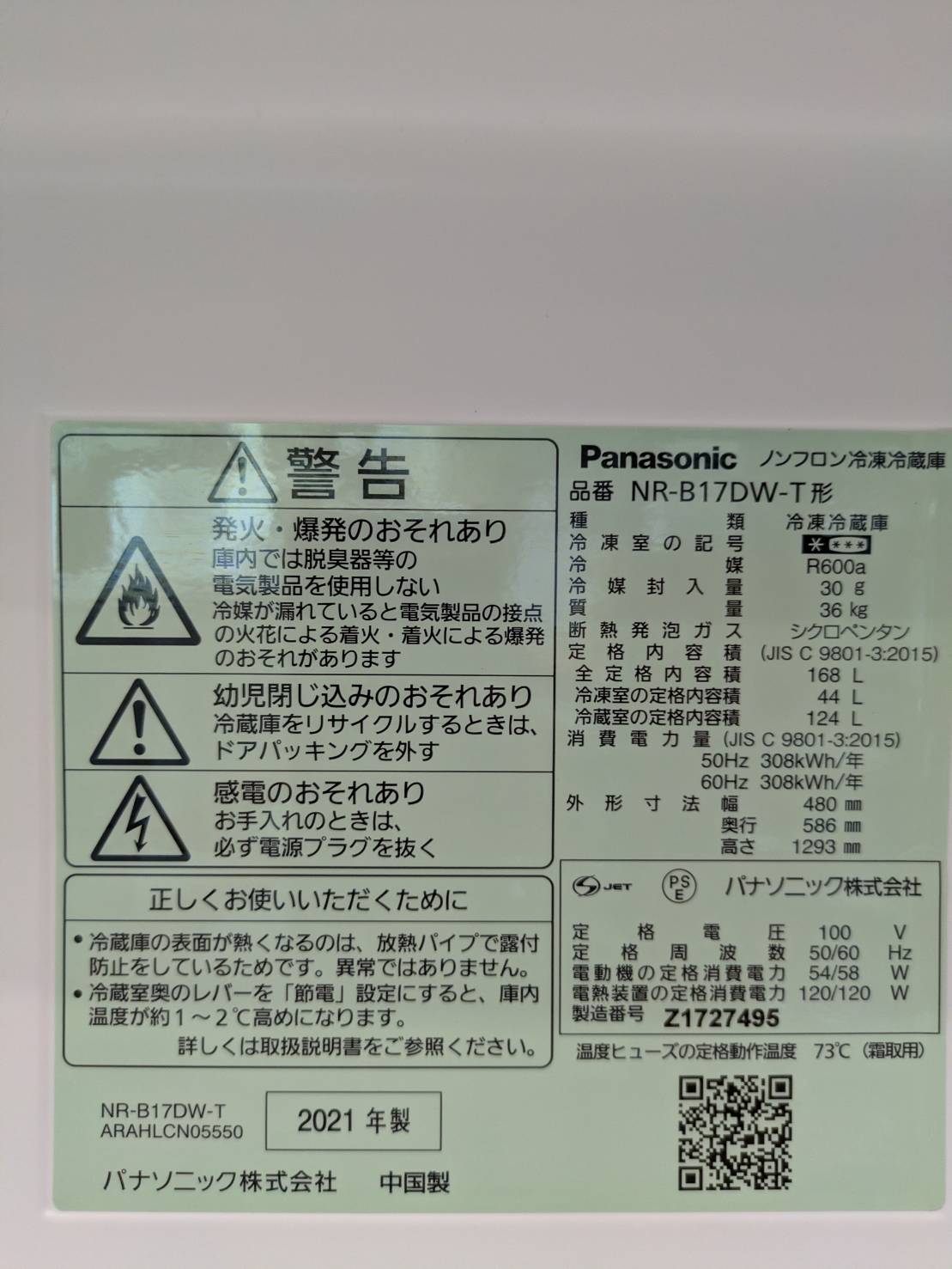 Panasonic2021年製168L冷蔵庫 NR-B17DW