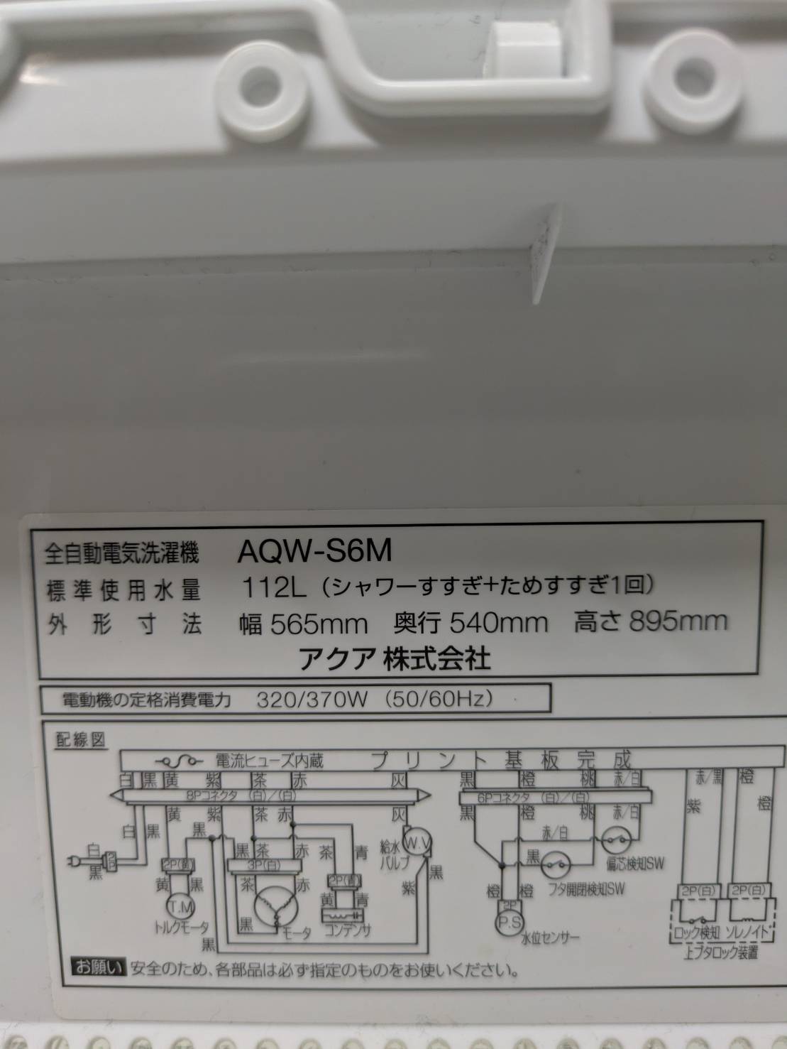 AQUA2022年製6.0Kg洗濯機 AQW-S6M