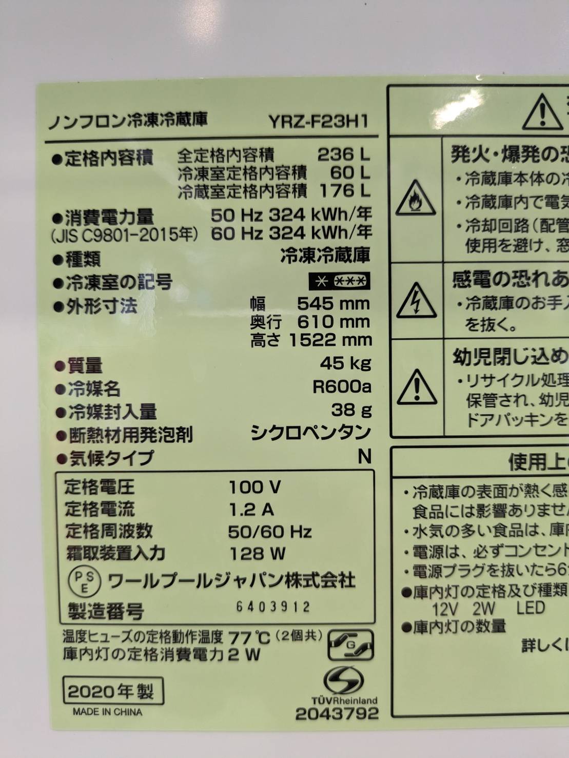 YAMADA2020年製236L冷蔵庫