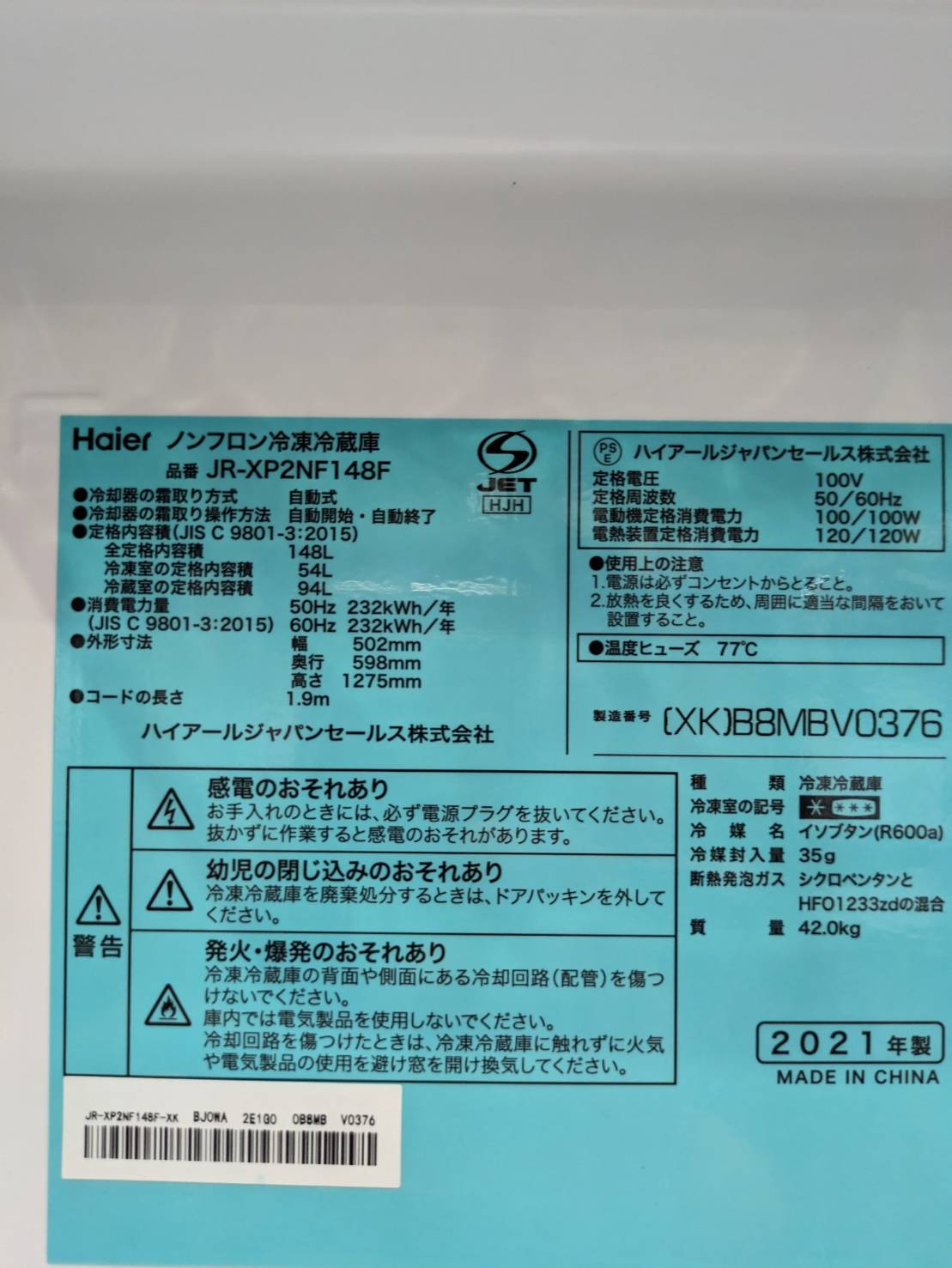 型番 JR-XP2NF148F