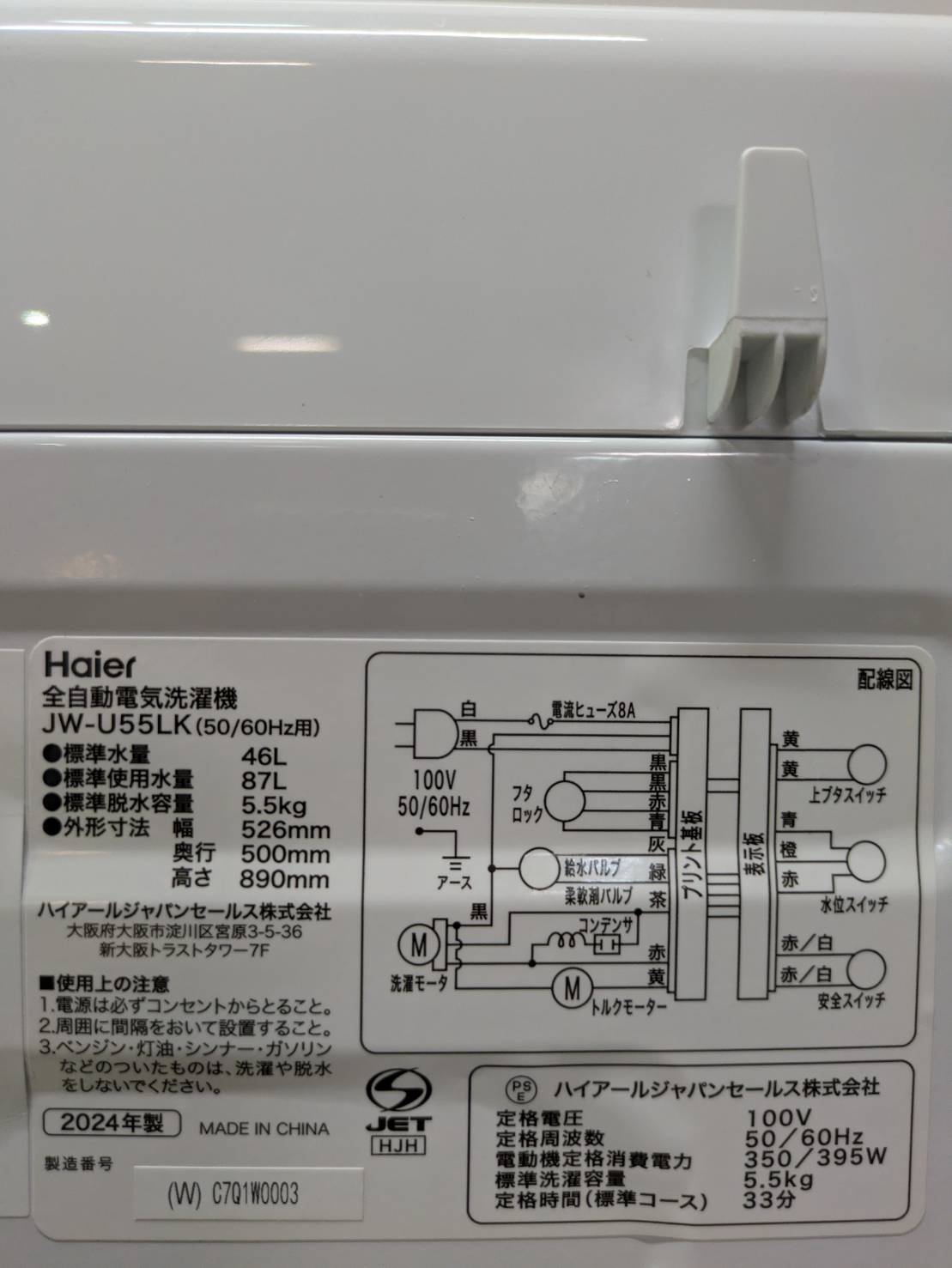Haier2024年製5.5Kg洗濯機 JW-U55LK
