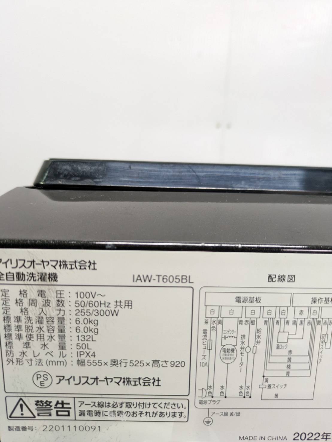 アイリス2022年製6.0Kg洗濯機 IAW-T605BL