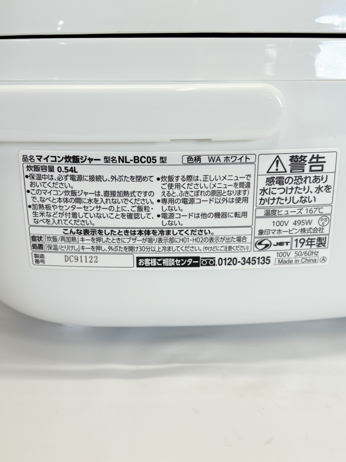 ZOJIRUSHI2019年製3合炊飯器 型番 NL-BC05 幅x高さx奥行き 235x195x325 mm 炊飯量 3 合 炊飯方式 マイコン 動作確認 OK 評価ランク B 【コンデションなど】 細かいキズがございます。 【保証期間】 商品到着から2カ月