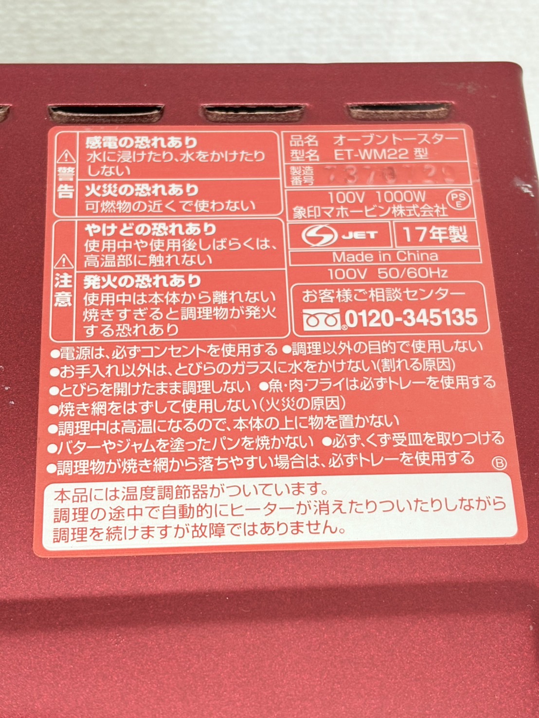 象印2017年製オーブントースター 型番 ET-WM22 本体サイズ 400x235x280 mm 庫内サイズ 270x110x220 mm 動作確認 OK 評価ランク B 【コンデションなど】 細かいキズや庫内使用感がございます。 【保証期間】 商品到着から2カ月