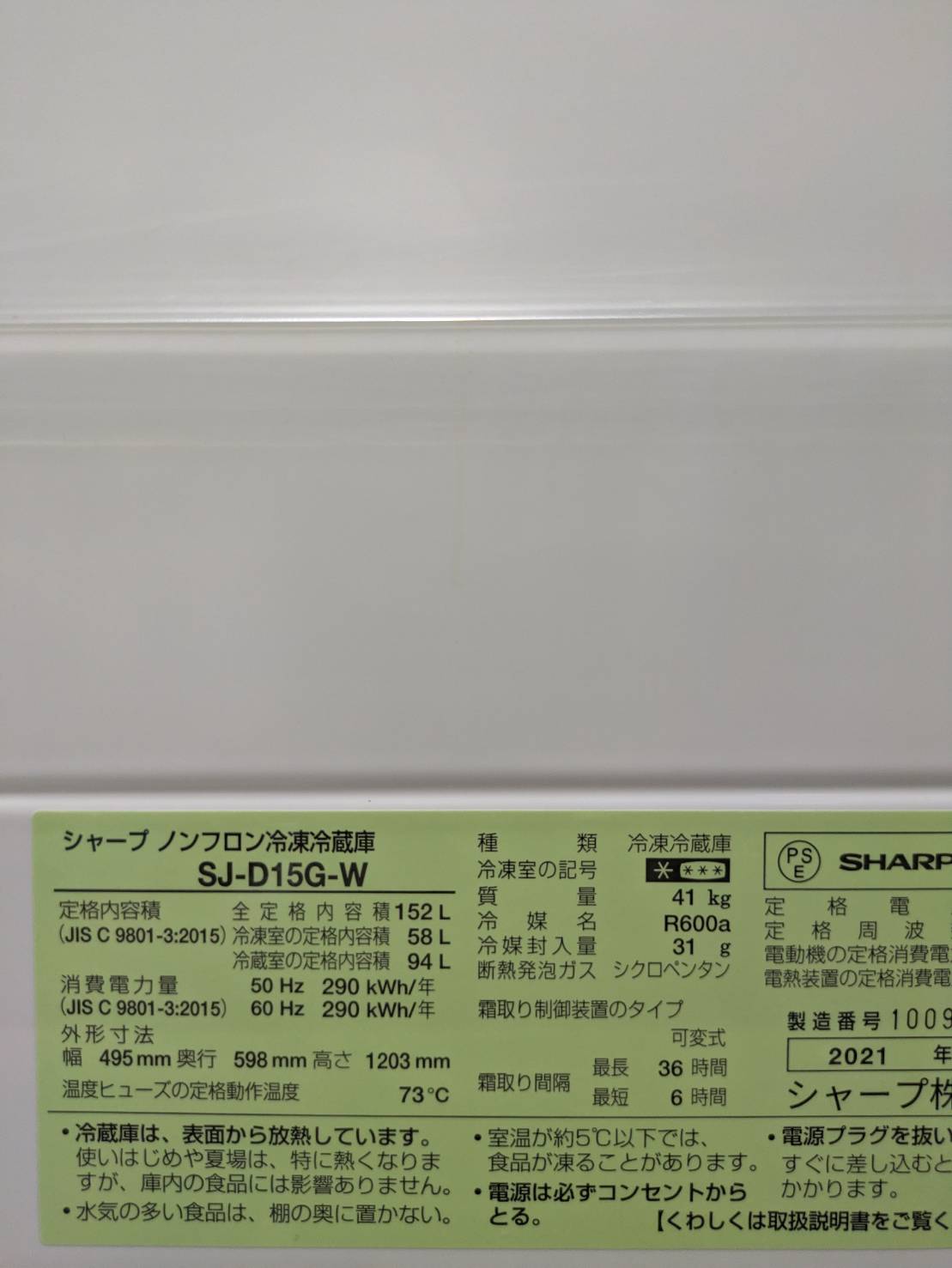 SHARP2021年製152L冷蔵庫 SJ-D15G