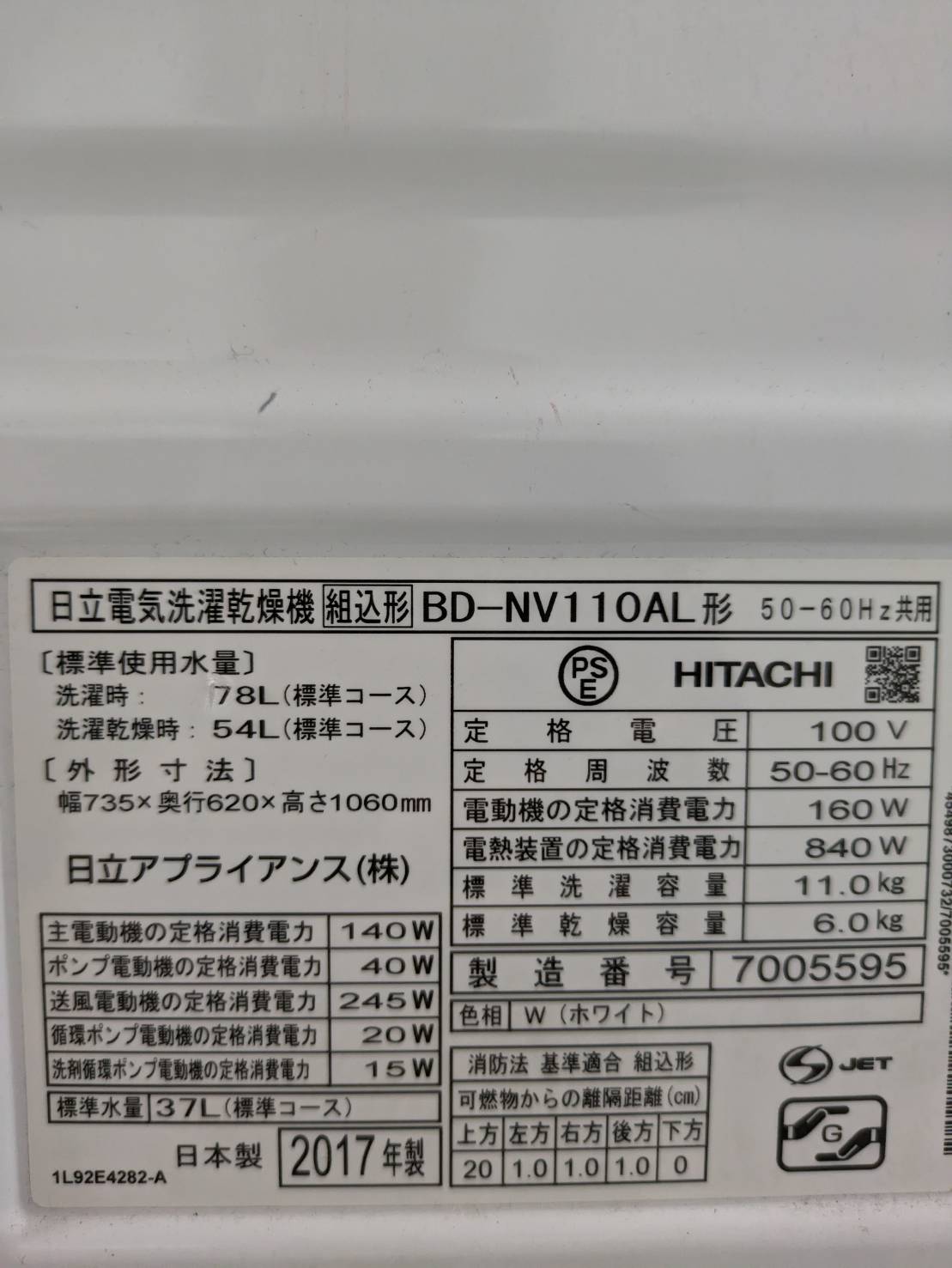 HITACHI2017年製ドラム式洗濯機 BD-NV110AL