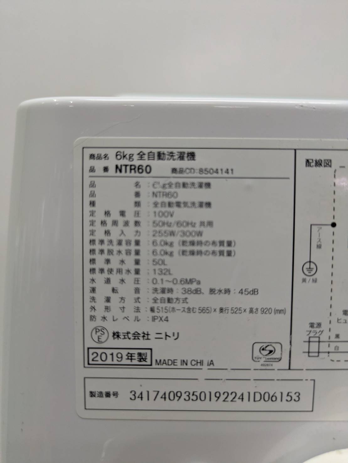 NITORI2019年製6.0Kg洗濯機 NTR60