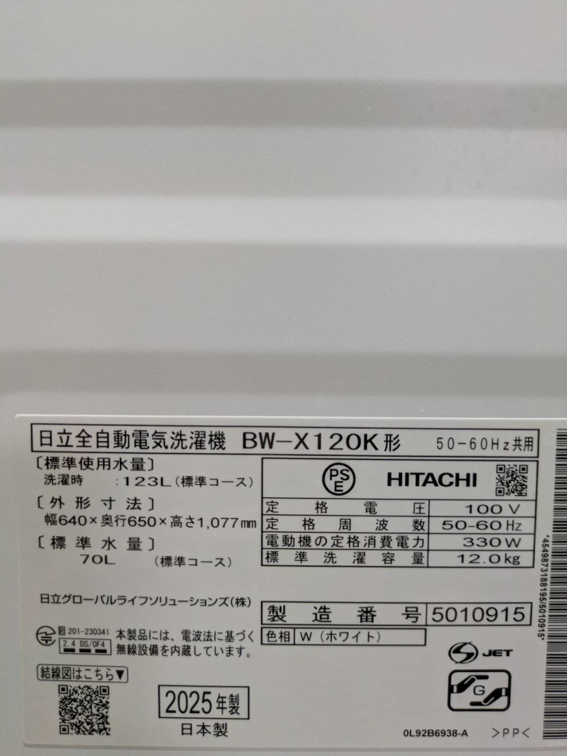 HITACHI2025年製12.0Kg洗濯機 BW-X120K