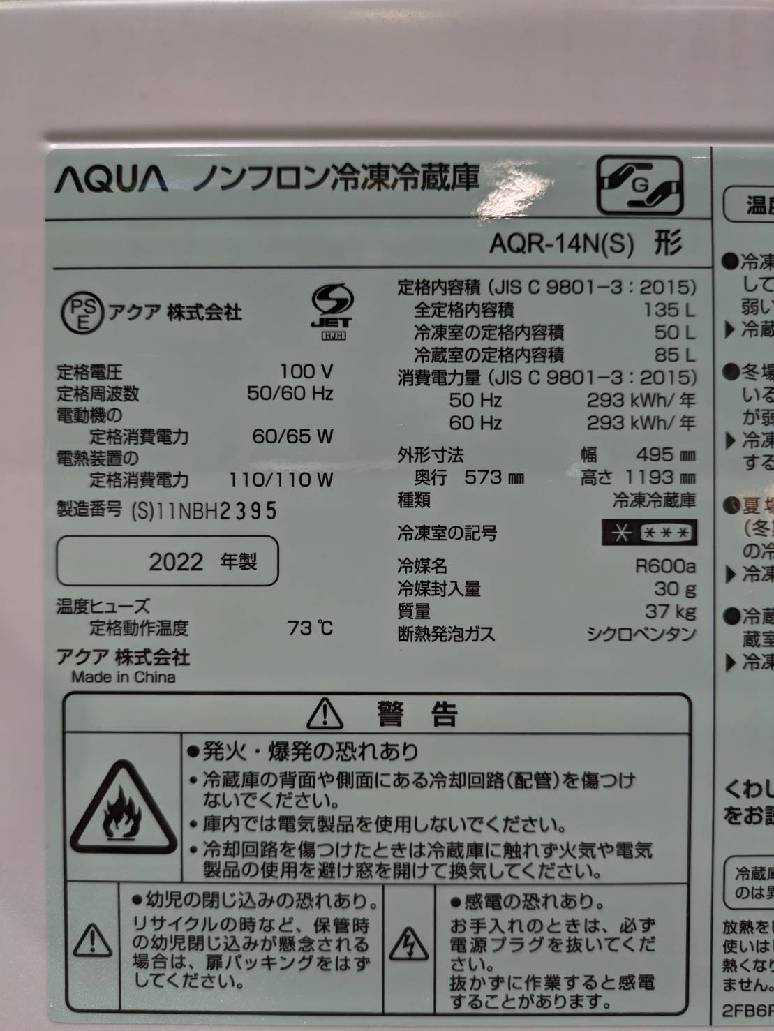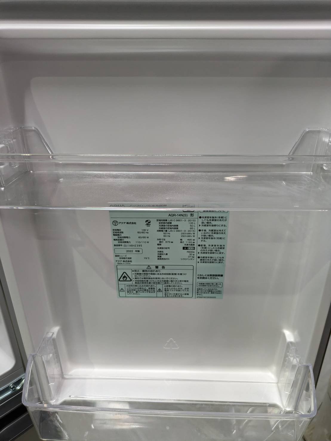 【訳有品】AQUA2022年製135L冷蔵庫 AQR-14N