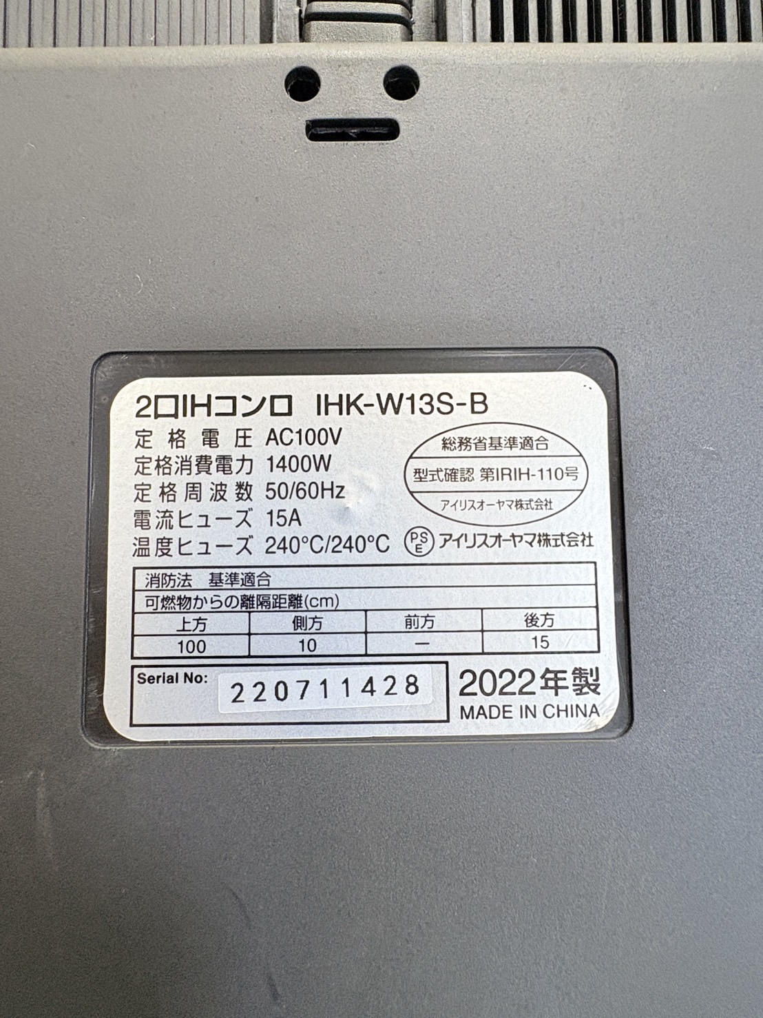 アイリス2022年製2口IHコンロ