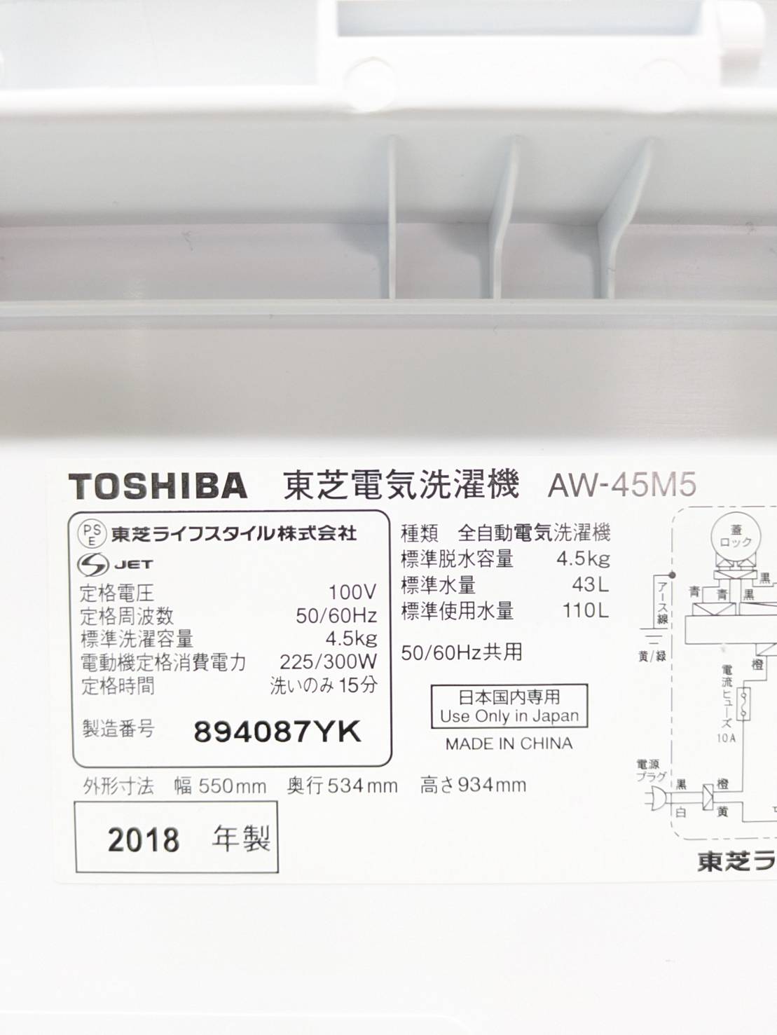 TOSHIBA2018年製4.5Kg洗濯機 AW-45M5