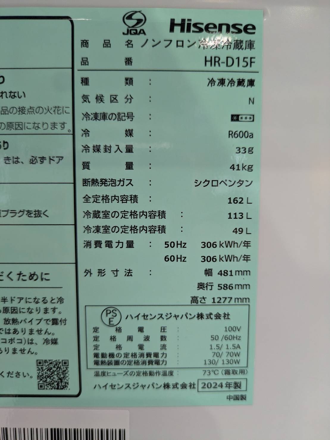 【訳有品】Hisense2024年製162L冷蔵庫 HR-D15F