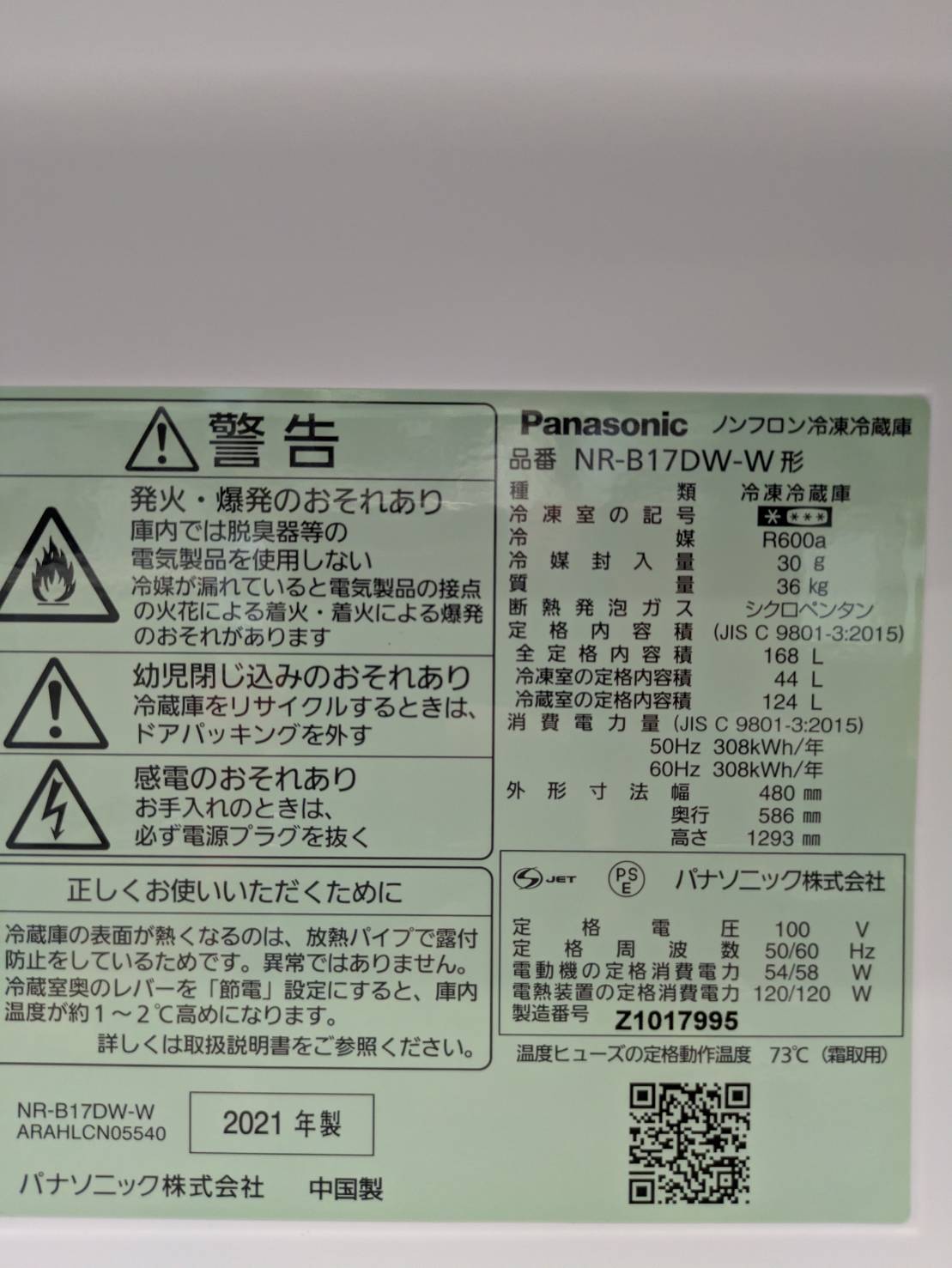 Panasonic2021年製168L冷蔵庫 NR-B17DW