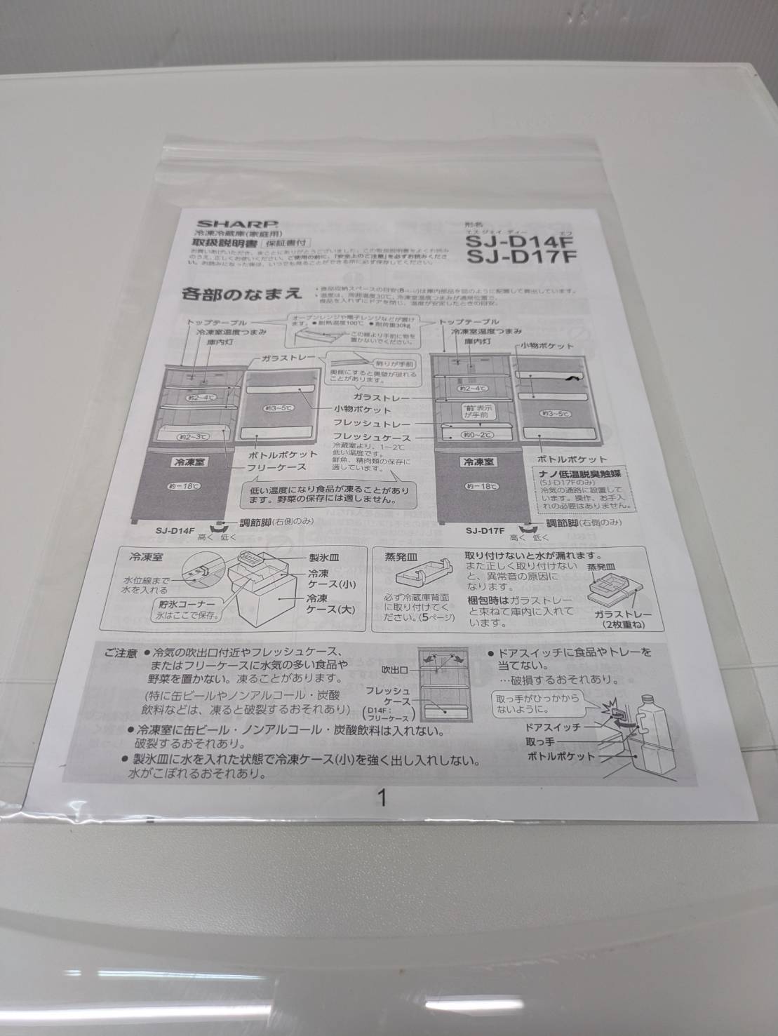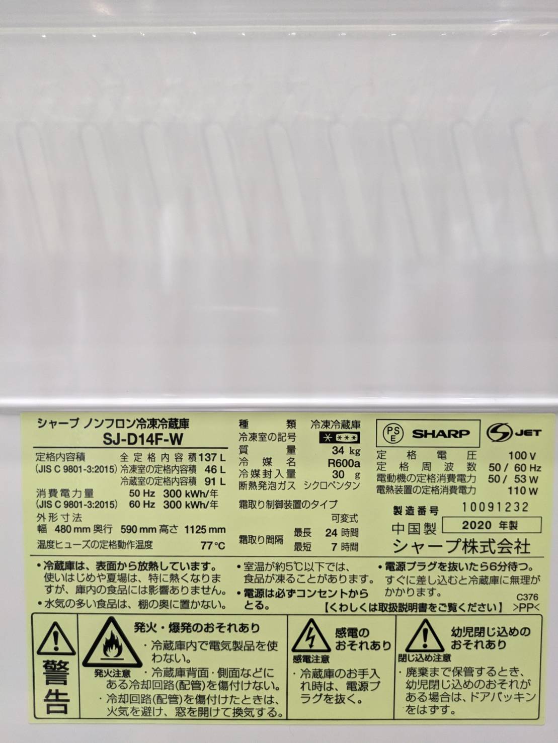 SHARP2020年製137L冷蔵庫 SJ-D14F