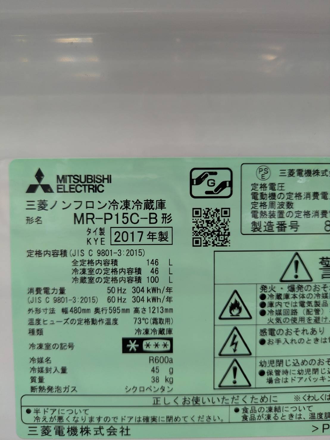 三菱電機2017年製146L冷蔵庫 MR-P15C