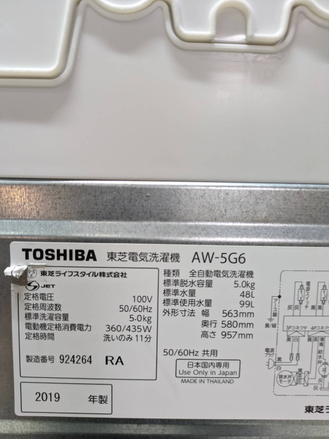 TOSHIBA2019年製5.0Kg洗濯機 AW-5G6