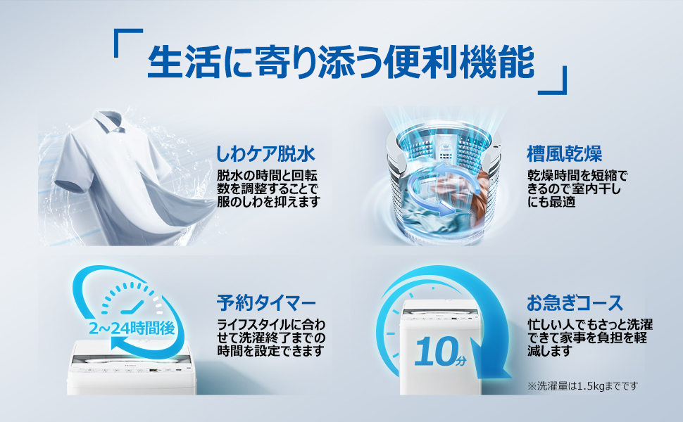 汚れが少ないときなど、10分で洗濯できる「お急ぎコース」を搭載した全自動洗濯機