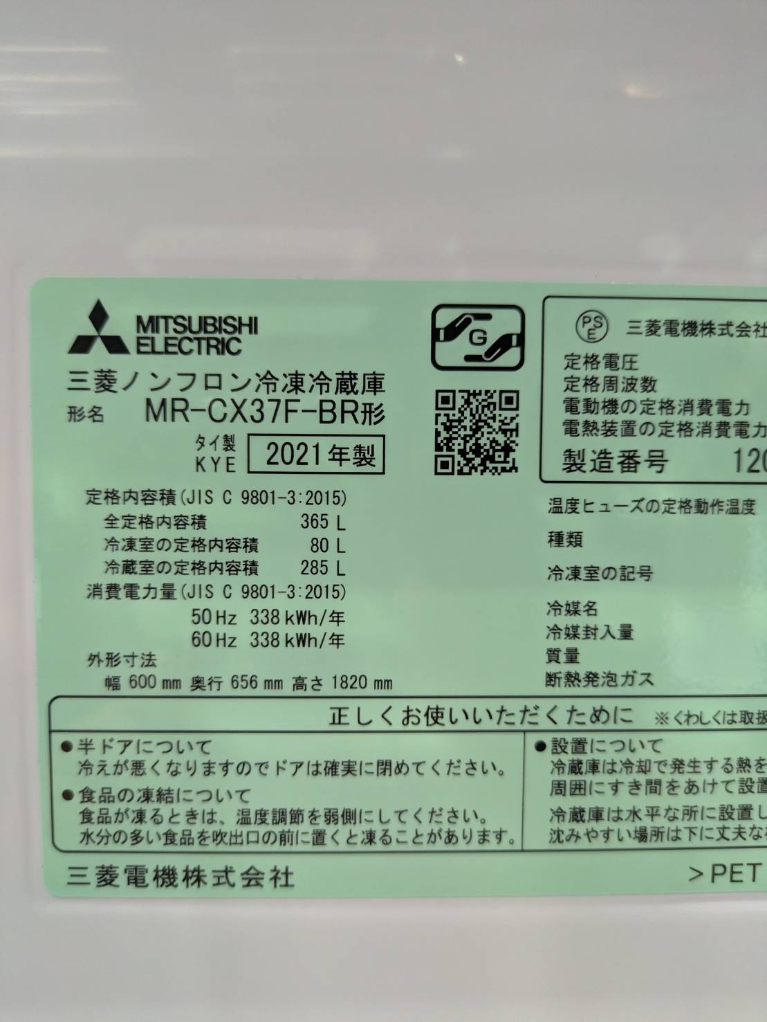 三菱電機2021年製365L冷蔵庫 MR-CX37F