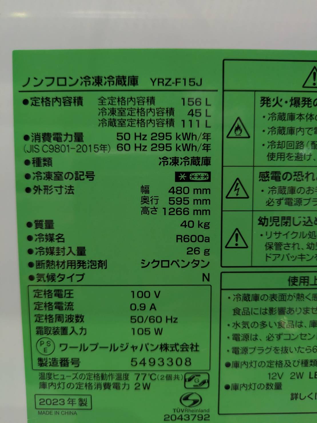 YAMADA2023年製156L冷蔵庫 YRZ-F15J