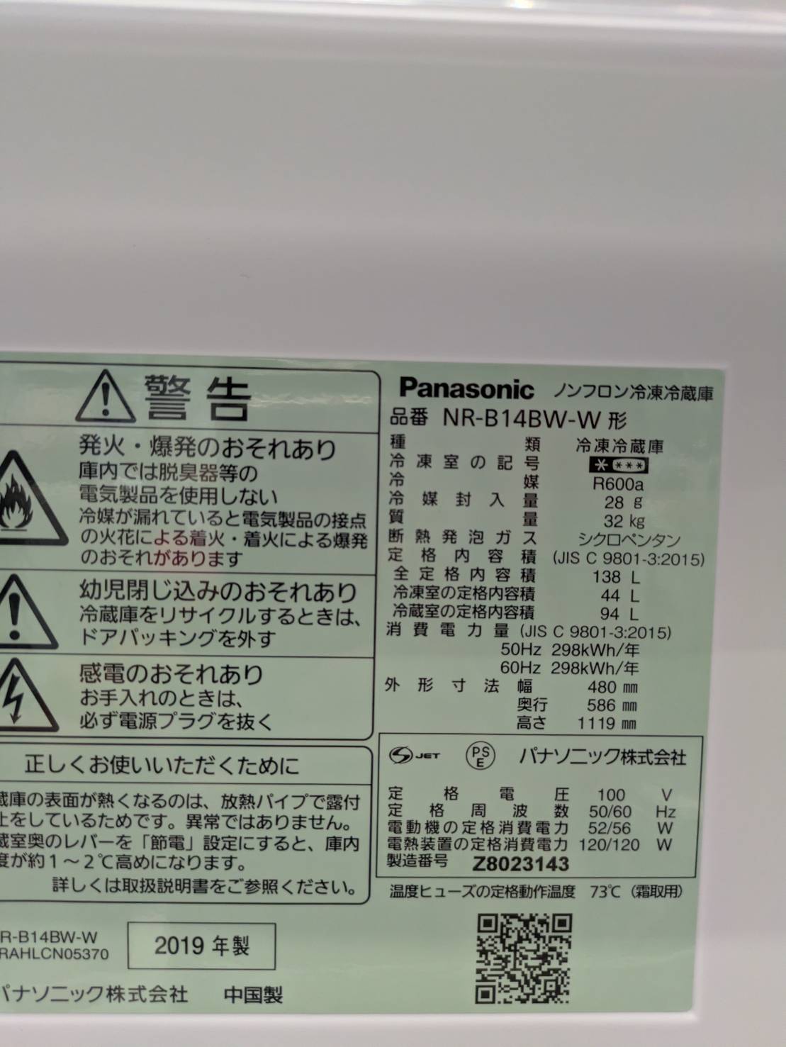 Panasonic2019年製138L冷蔵庫 NR-B14BW