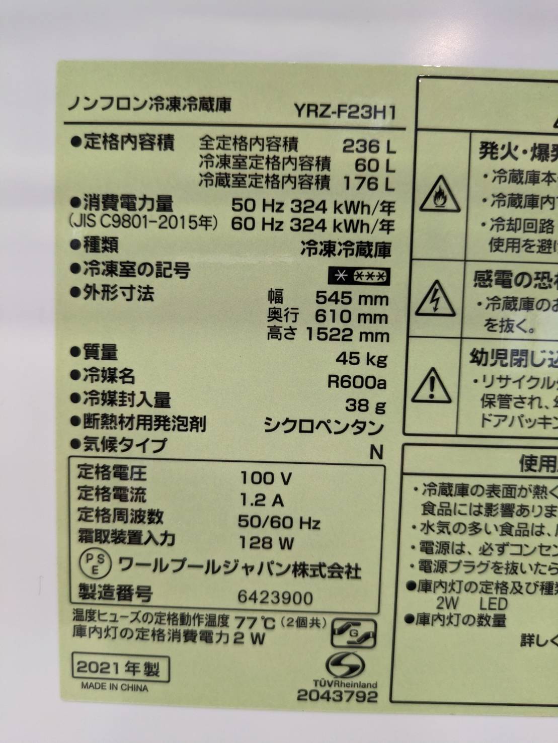 YAMADA2021年製236L冷蔵庫 YRZ-F23H1