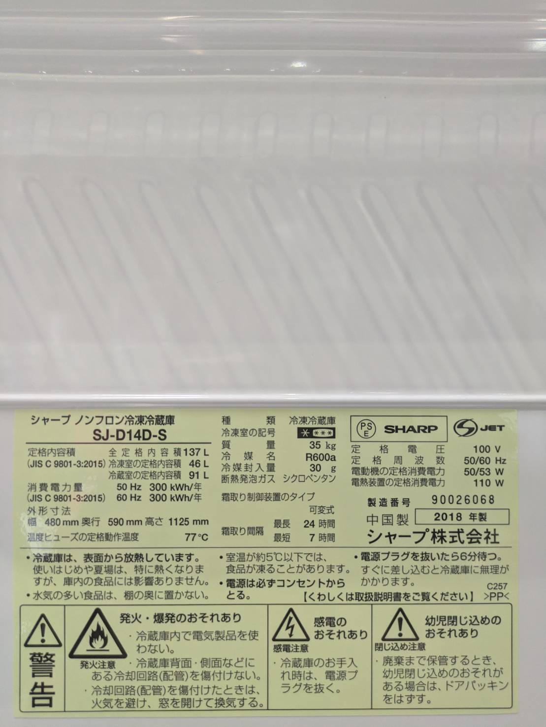 SHARP2018年製137L冷蔵庫 SJ-D14D