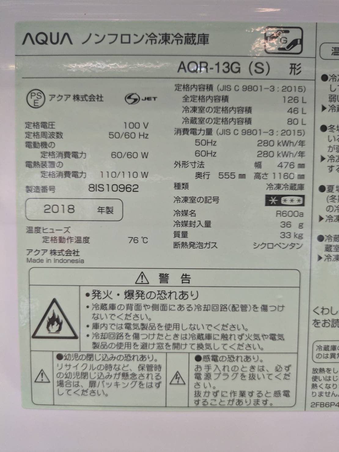 AQUA2018年製126L冷蔵庫 AQR-13G