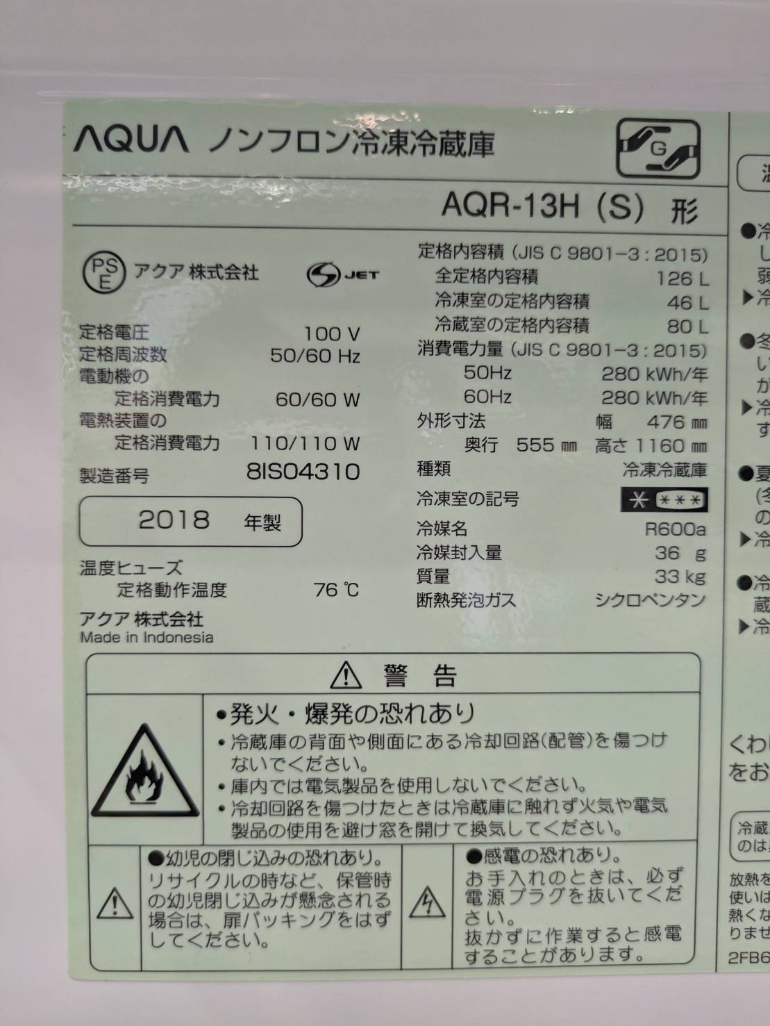 【訳有品】AQUA2017年製126L冷蔵庫 AQR-13H