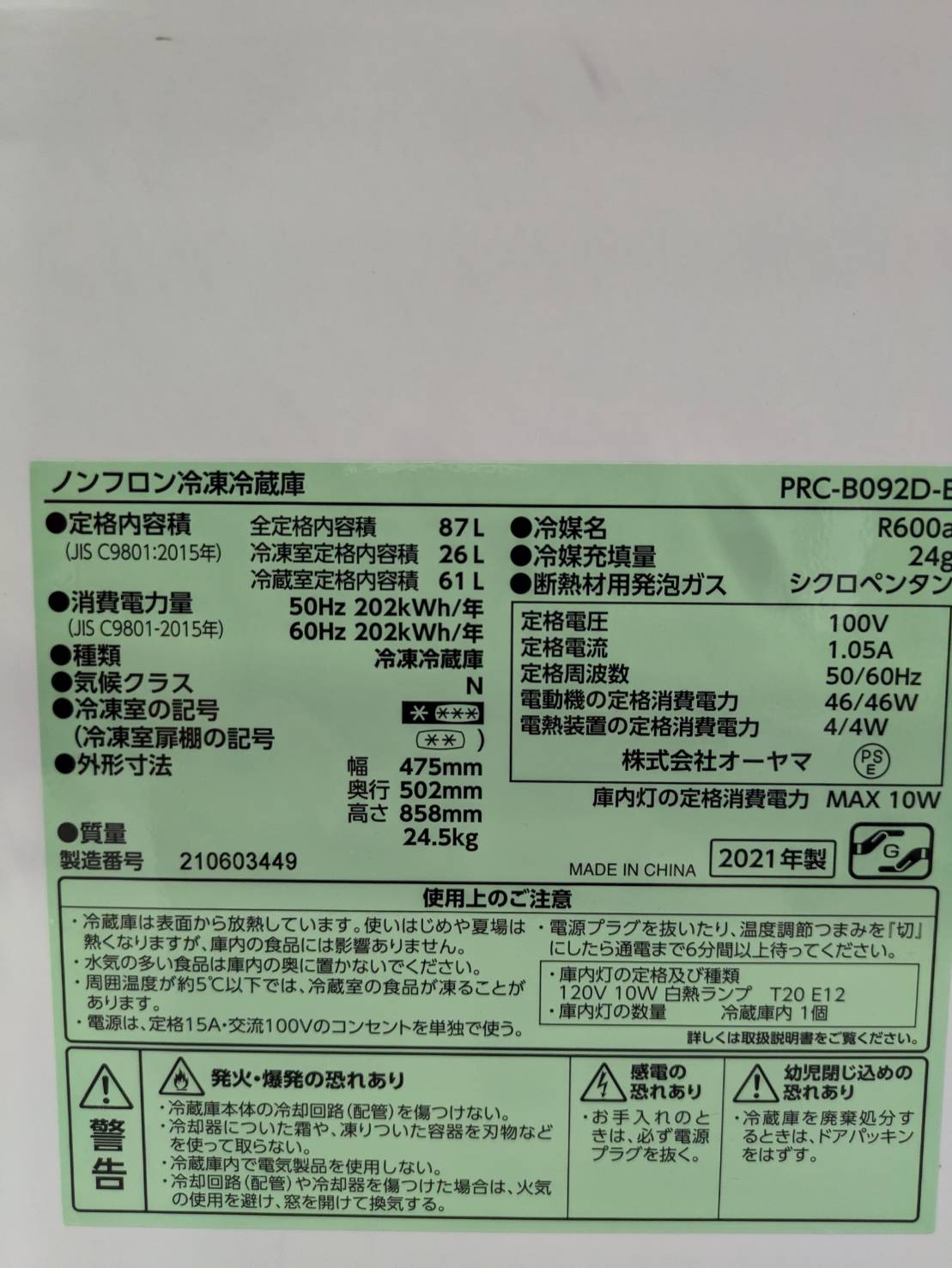 アイリス2021年製87L冷蔵庫 PRC-B092D