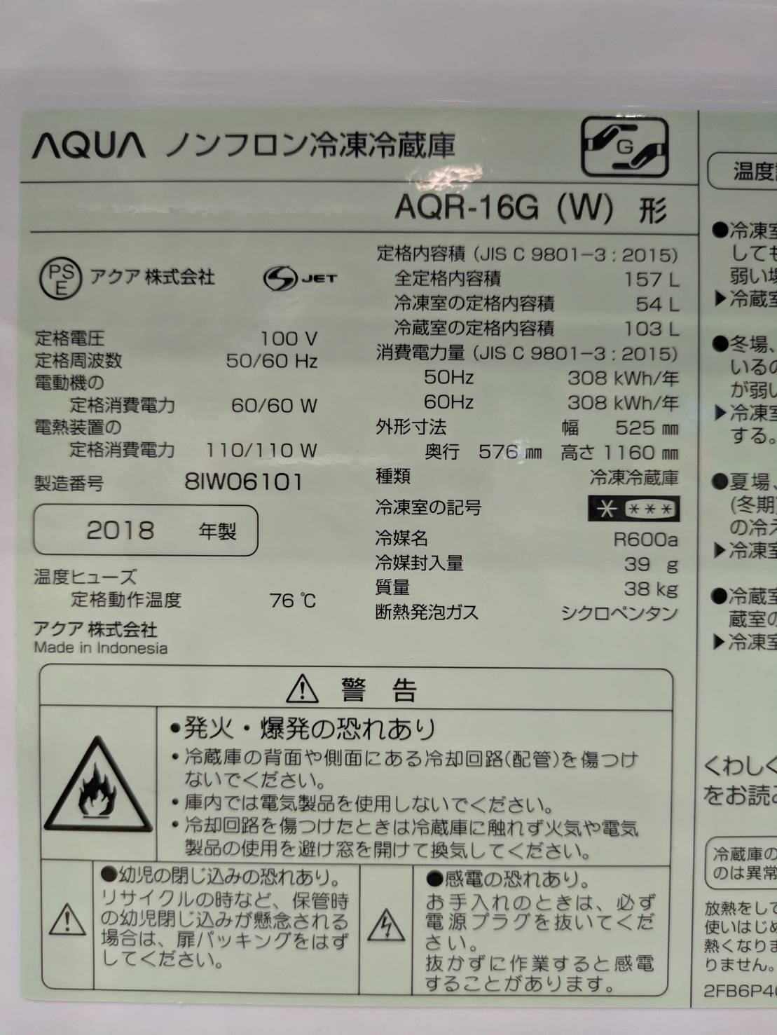 AQUA2018年製157L冷蔵庫 AQR-16G