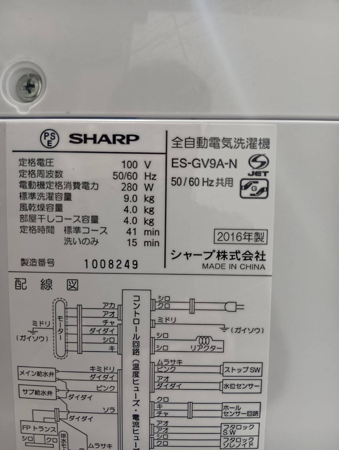 SHARP2016年製9.0Kg洗濯機 ES-GV9A-N